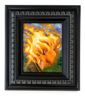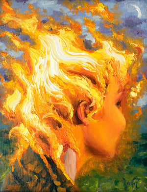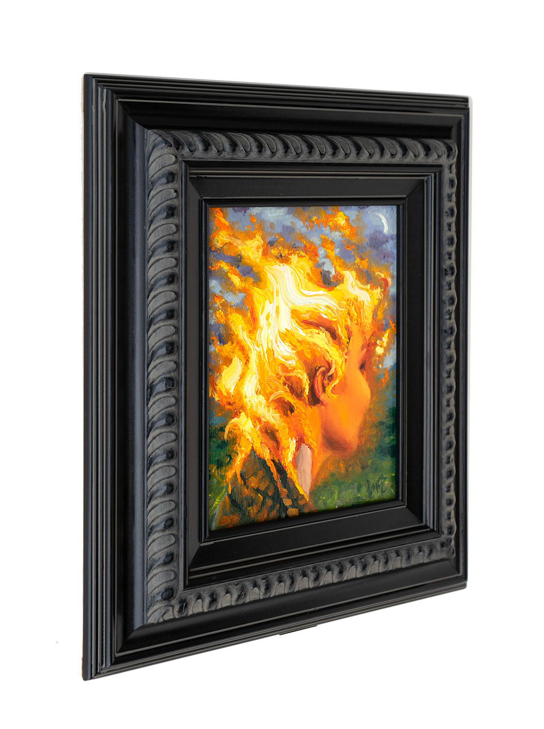I use either oil paint or charcoal when creating my pieces. With oil I’m able to create a thick and heavy impasto texture to insinuate the movement of flame. The heavy texture also shows the weight of the flame that is consuming the individual, while simultaneously creating an aesthetically pleasing surface. My work is based in realism but leans toward surrealism by exposing our unconsciousness."