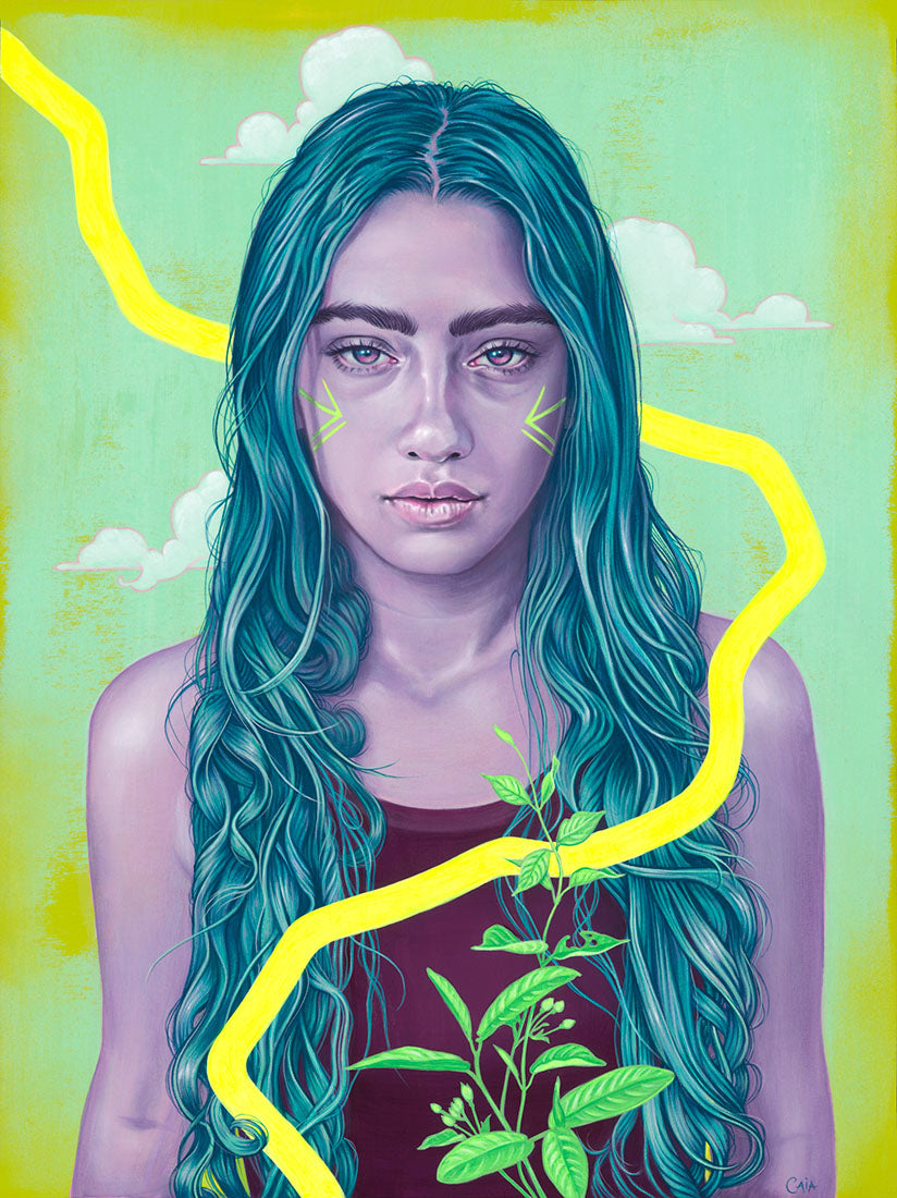While attaining her BA in Fine Arts from the University of California in Santa Cruz, Caia was a skateboard enthusiast immersed in the punk rock scene of the ‘80s. She continues to live in Santa Cruz where the youthful vitality of a college town is an ever-present, pulsating force. Her professional career began by creating designs for skateboards and snowboards. Enchantingly beautiful female characters in her paintings are imbued with this fearless sense of defiance. As a second-generation conservationist, loving the environment and acutely aware that humanity is dangling our planet over a dangerous flame of pollution, nature is often woven into the haunting fabric of her images. Birds, flowers, plants, butterflies, animals and mythical creatures are interlaced with iconic symbols of love, mystery, soul searching and timeless values. Lurking throughout these visual fantasies are “Día de los Muertos” skulls, cute yet macabre reminders of the interlocking yin and yang of life and death.