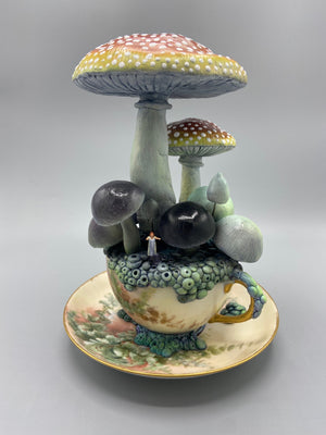 "My work explores our connection to the mysterious fungi kingdom. I’m curious about death and what lies beyond. As decomposers of dead, organic matter, mushrooms are symbols of the imminent life and death process. They release enzymes to feed on dead, organic matter. It’s a fascinating juxtaposition; an organism that cleans and clears away dead matter and an entheogen that, when ingested, brings about transcendent states of consciousness.