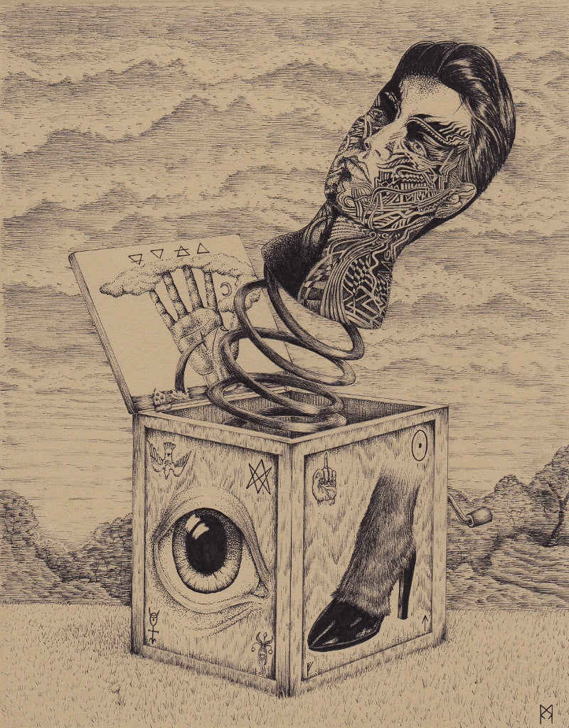 Ronnie Ray Mendez is a visual Artist born and bred in Southern California. From childhood he found his voice through music and visual art, and continued through his studies in Fine Art and Illustration at California State University, Fullerton. The subject matter of Ronnie Ray’s work strongly reflects his turbulent childhood and his early exposure to the Dark elements of life. He is a purveyor of Aestheticism, Romanticism, and Symbolism, as he fuses various elements of reason and primal human characteristics. Ronnie Ray’s work is executed with complex detail and classical techniques of stippling and cross-hatching. He is a true conjurer with ink and paper.
