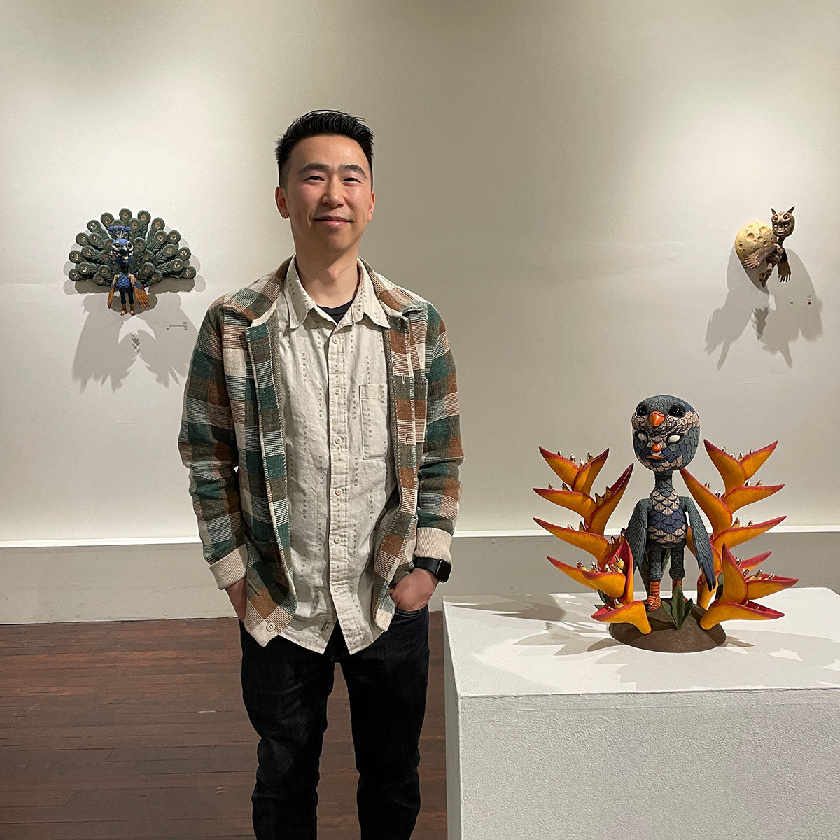 We are pleased to present the latest solo exhibition of new ceramic sculptures by San Francisco artist, Calvin Ma. Calvin was born and raised in San Francisco, California. His unique and intricate works are hand-sculpted and painted in his studio in the Bayview. Throughout the series, the artist weaves a story in between the clay, the feathers, and the figure––from small and playful pieces, to multi-piece arrangements and narratives.