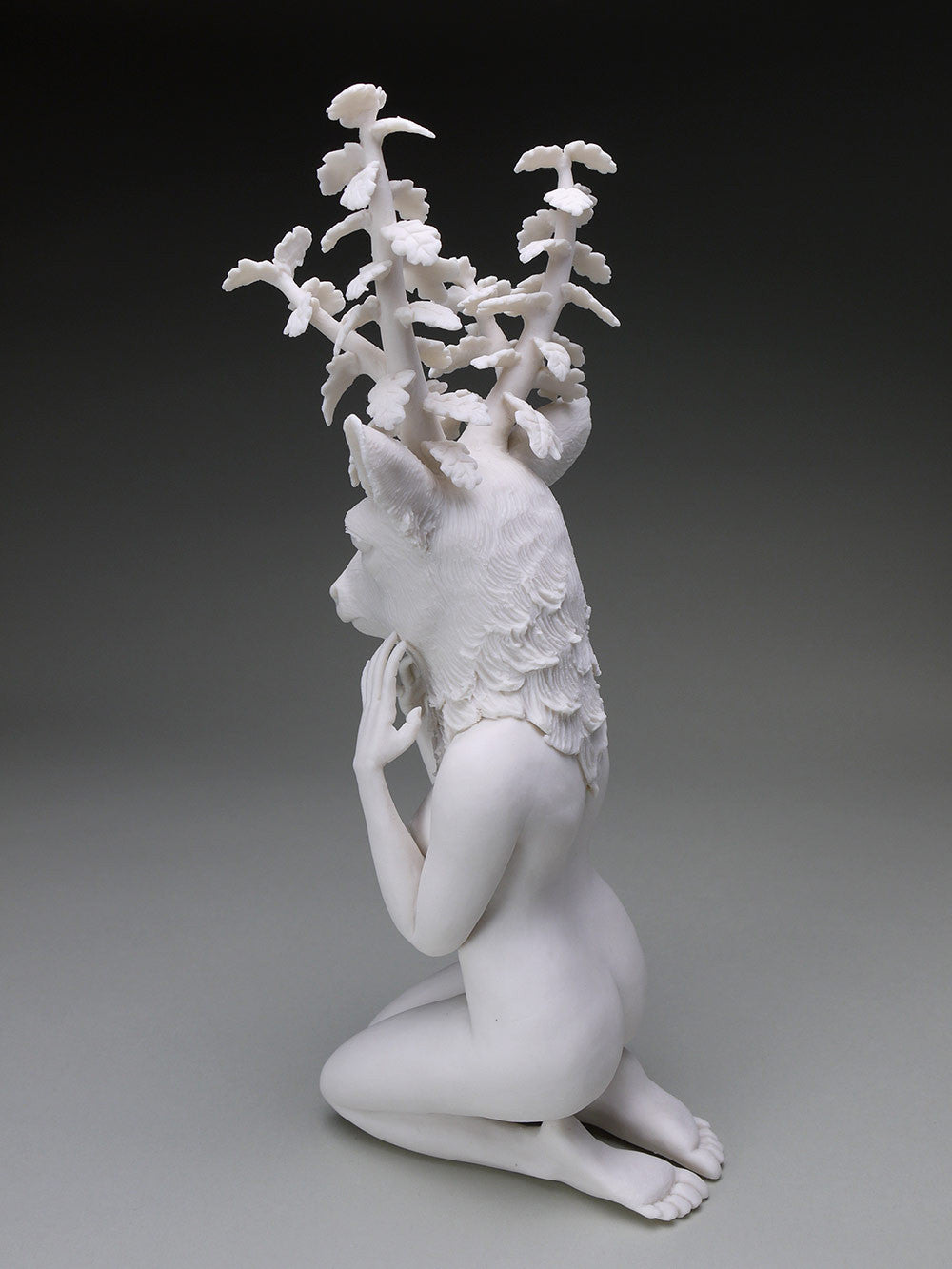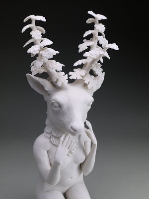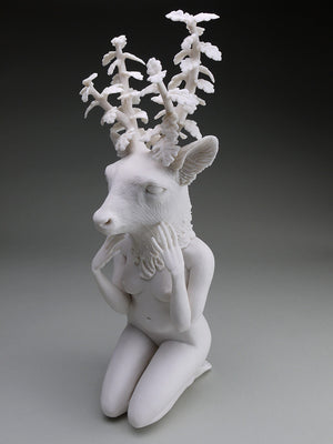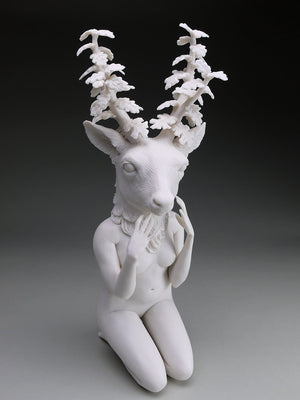 Delicate Dependencies is an exploration of these ideas shown through plants and animals native to the western United States. These creatures exist in habitats stressed or impacted by human activity, leading them to an unclear future. They inhabit a space where the relationship between humans, and the plants and animals around them, are intricately and physically bound together, dependent on each other for their long-term viability. Sculpted from the silken white earth of porcelain, I see these delicate figures as containing power, as modern talismans and precious telling objects. They see a heightened vision of human influence in the natural world and are here to remind us of our current trajectory and the delicate dependencies we all share.