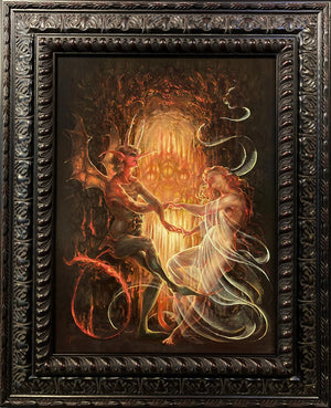 J. Henry "The theme in a lot of this work comes from “untold tales,” vignettes of characters participating in a world separate from ours. I wanted to reflect the experience that one might have in a museum, when you stumble across a really weird piece of art from ages ago, whose purpose was to tell lessons and sing songs, but the aesthetic canons and technical methods of the time make it much more than just that, both foreign and familiar at the same time. Additionally, whether in a piece’s detail or entirety, I wanted to explore the idea of architectural ornament coming to life. I don’t like the idea that today’s generation of design robs the public of celebrating and being surrounded by the applied arts. (Everybody deserves gargoyles and acanthus leaves.) When enough care is put into detail, not only is it a more cherished product as a whole but that detail can take on a life of its own, stimulating the mind to create stories and training the eye to see beauty everywhere, which is essential for personal harmony in the best and the worst of times. This collection of paintings began with a fascination of rocaille grotesque, a newfound interest that started when I began studying architectural ornament, faux finish and trompe l’oeil as scenic painter for theater. This threw me down a rabbit hole of exploring the themes and motifs of historical ornament and costume that helped me set the world of these paintings in a grounded, albeit fantasy, time period. It also reawakened a lot of forgotten influences, like woodcarving and tattoo art, that, now with different eyes, I could draw parallels to to help me make design choices and technical decisions. The most beautiful designs are always ones that celebrate the shapes of nature. As a final kind of fun note, this body of work was done over the course of the last two years. A lot of them follow “palette phases,” and can kind of be identified chronologically by their overarching color."