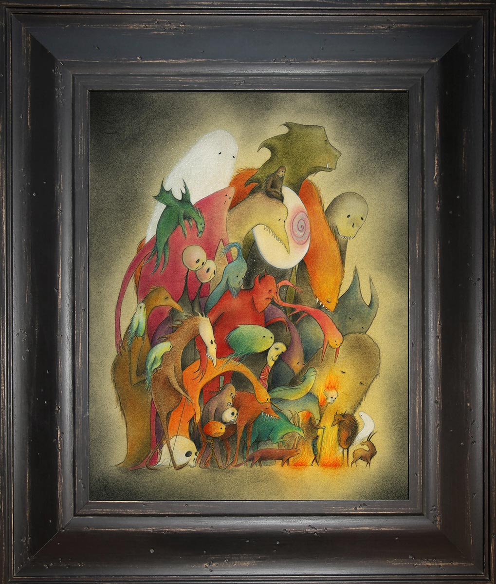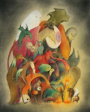 Jeannie L Paske is a self-taught artist from Portland, Oregon who creates introspective work under the name Obsolete World. Using a mix of watercolor, charcoal, pastel, graphite, varnish and ink, she designs richly textured illustrations of peculiar creatures in thought-provoking settings. The mysteries of life, loss and loneliness are reoccurring themes, and her compositions often focus on the strange and unexplained. Many of her pieces reference philosophy with a nod to both the melancholy and humorous. Her soft sparse environments suggest a warm, dreamlike state, and the emotional imagery paired with her poetic titles help to convey a sense of gentle curiosity in her work.