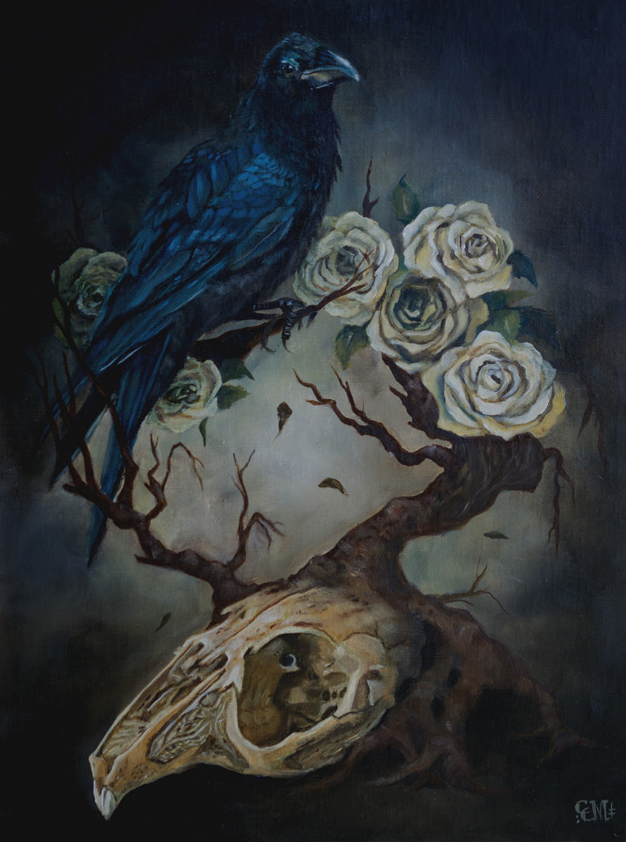 Catherine Moore was born in San Leandro, California, but spent her formative, and awkward, teenage years amidst the neon lights and desert landscape of Reno, Nevada. In 1998, she returned to the Bay Area to pursue her fine arts degree and graduated from the Academy of Art University in 2004. She worked for several years as a freelance illustrator and graphic artist and began exhibiting her work in 2011. She currently lives with her husband, son, and doggy companion in San Leandro.