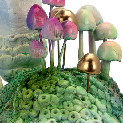 "My work explores our connection to the mysterious fungi kingdom. I’m curious about death and what lies beyond. As decomposers of dead, organic matter, mushrooms are symbols of the imminent life and death process. They release enzymes to feed on dead, organic matter. It’s a fascinating juxtaposition; an organism that cleans and clears away dead matter and an entheogen that, when ingested, brings about transcendent states of consciousness.