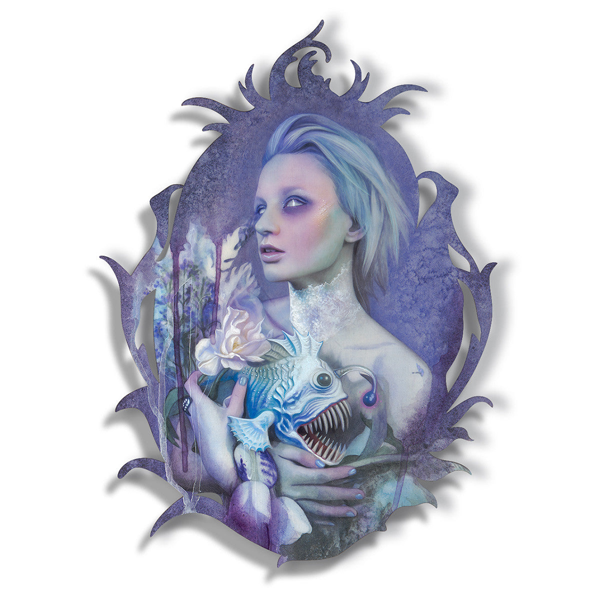 • With this piece “Harmless Monster", I wanted to explore the notion of woman as “The Other.” Often throughout history, mythology and fiction we see frightening supernatural women, who are in part unknowable because of their femininity. My little monstrous siren is holding a deep sea angler fish - a species where the males are almost superfluous (they exist only as tiny sperm packets). Angler fish look alien and terrifying to us as well, but they are merely a creature perfectly adapted to a harsh environment.