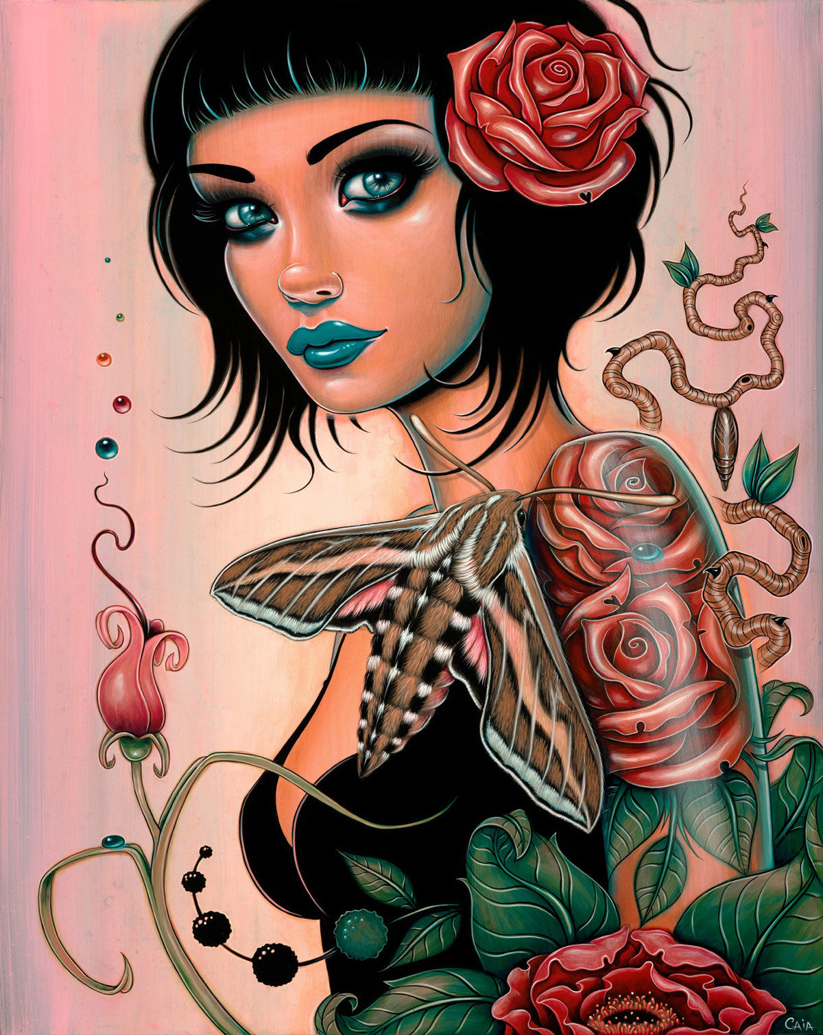While attaining her BA in Fine Arts from the University of California in Santa Cruz, Caia was a skateboard enthusiast immersed in the punk rock scene of the ‘80s. She continues to live in Santa Cruz where the youthful vitality of a college town is an ever-present, pulsating force. Her professional career began by creating designs for skateboards and snowboards. Enchantingly beautiful female characters in her paintings are imbued with this fearless sense of defiance. As a second-generation conservationist, loving the environment and acutely aware that humanity is dangling our planet over a dangerous flame of pollution, nature is often woven into the haunting fabric of her images. Birds, flowers, plants, butterflies, animals and mythical creatures are interlaced with iconic symbols of love, mystery, soul searching and timeless values. Lurking throughout these visual fantasies are “Día de los Muertos” skulls, cute yet macabre reminders of the interlocking yin and yang of life and death.