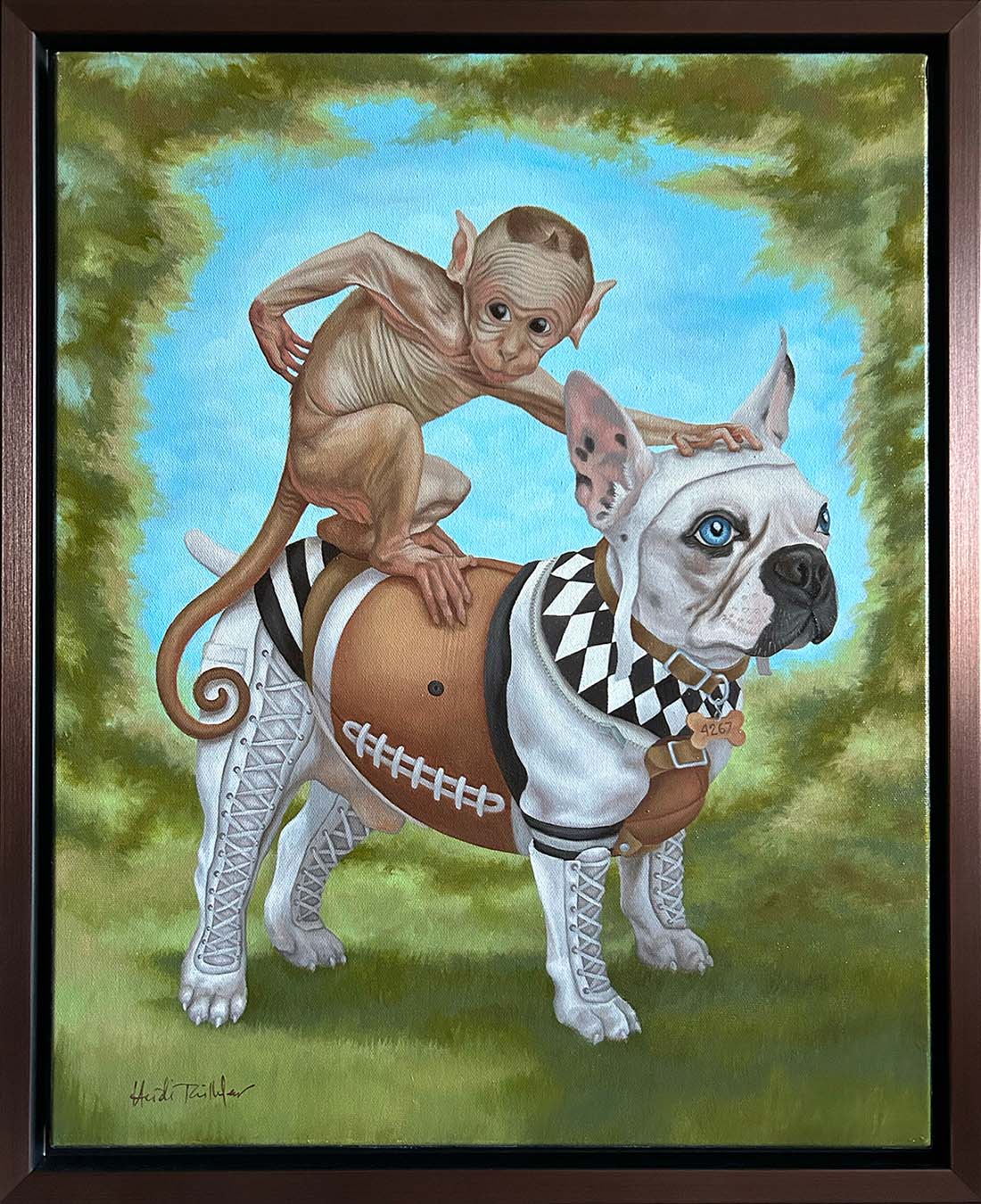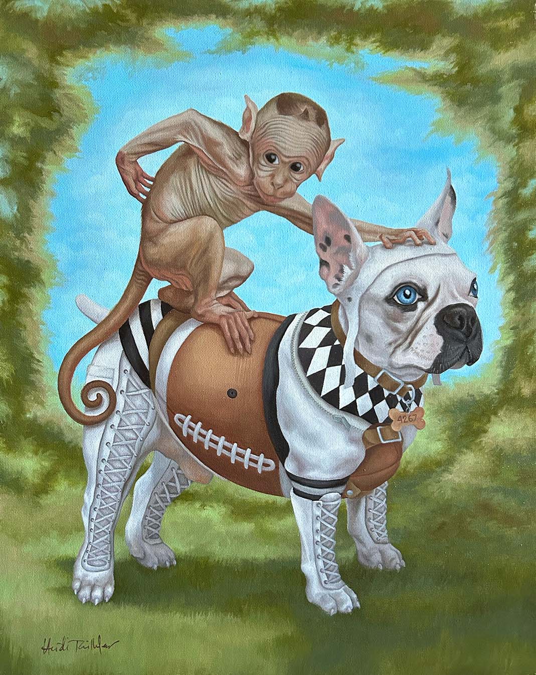Her paintings often depict subjects comprised of seemingly incongruous objects characterized as symbolic, which form a complex composite of elements and add a contemporary spin to often classical icons. Taillefer's work highlights our growing hybridization with technology, in which she depicts “machine-like” constructions. Her approach is to infuse primordial aspects of the human condition into these hybridized humans and animals, and seeks to remind the viewer of the inescapable nature of our being despite our increasing merger with technology.