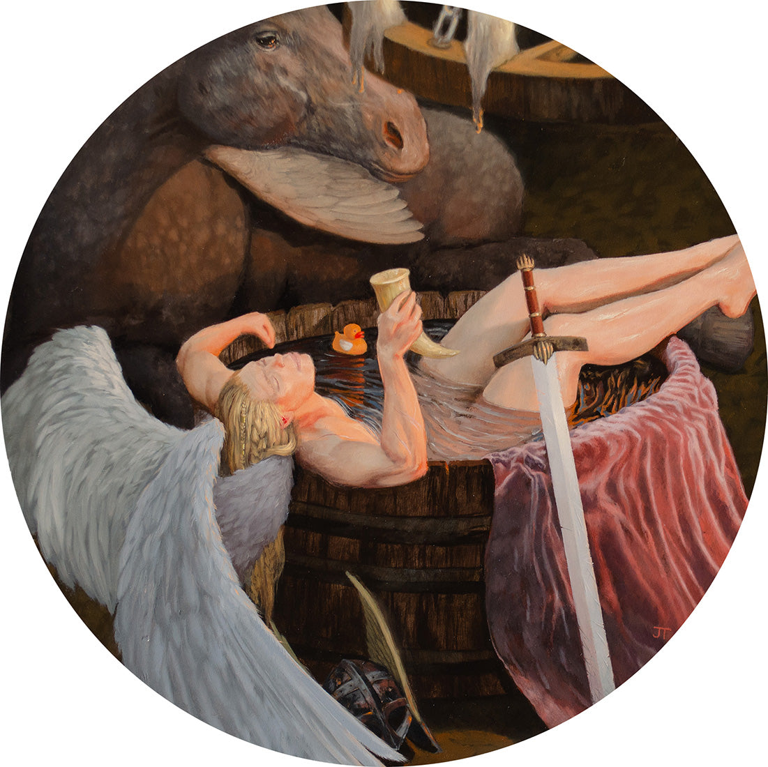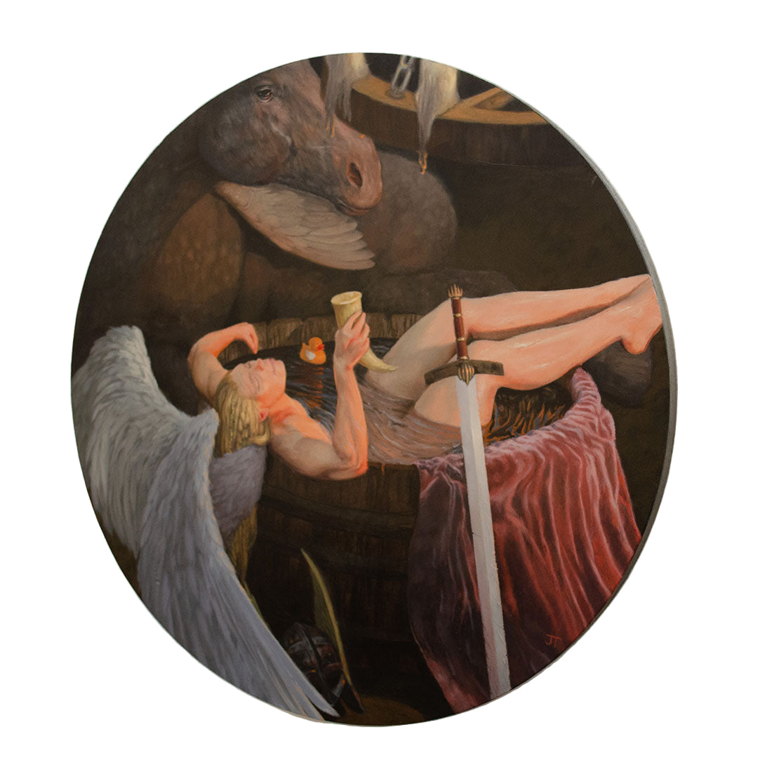 Jo’s approach to oil painting combines an academic mind set with experimentation. Implementing a rigorous concept and design process helps her dial in the precise emotional message for each painting, while thoughtfully crafting the image. Dramatic lighting and dynamic composition often work together to unify the narrative of each piece. Jo frequently works in layers in order to gradually coax her thematic elements to life, while also lending the work a dreamlike quality.