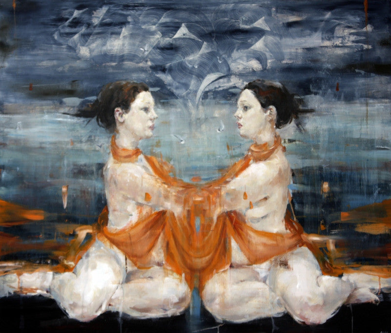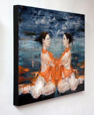 “In ‘Indra’s Net’ I wanted to explore the ways in which people build and break boundaries between ourselves and our world. Our natural propensity to create artificial distinctions is eclipsed by our knack for finding connections through the means of vision, empathy, and insight. These are ideas I wanted to express both figuratively and conceptually. The depiction of reflected images within and around figures whose features are at once obscured and exaggerated, whose boundaries are at times undefined as they momentarily merge with their environment, delineates the pathways of our sometimes muddled perception. Contrasting with this is the imagery of fish, whose clear, ever-opened eyes are said to impart perpetual awareness to the unconscious. Fish, along with birds, are early and unambiguous indicators of the state of the environment which surrounds us, bestowing upon us a silent foresight.