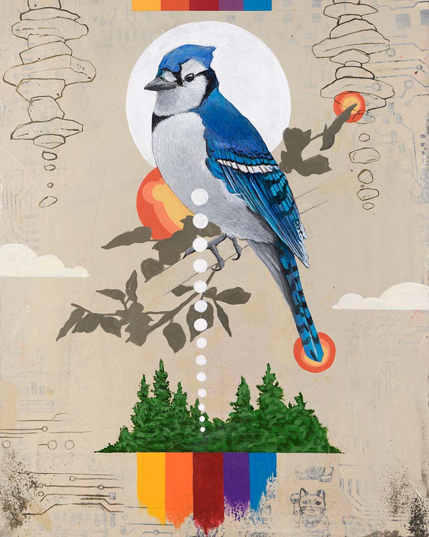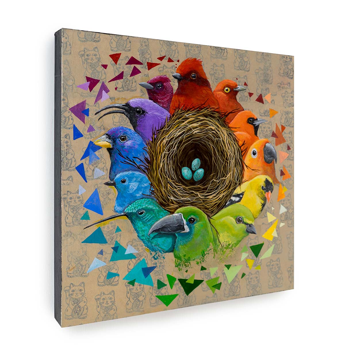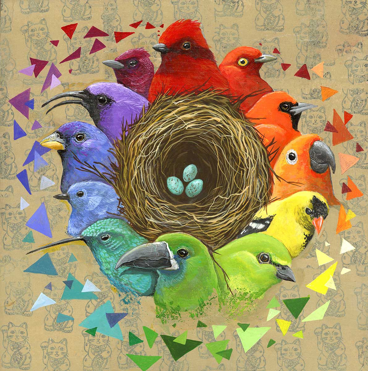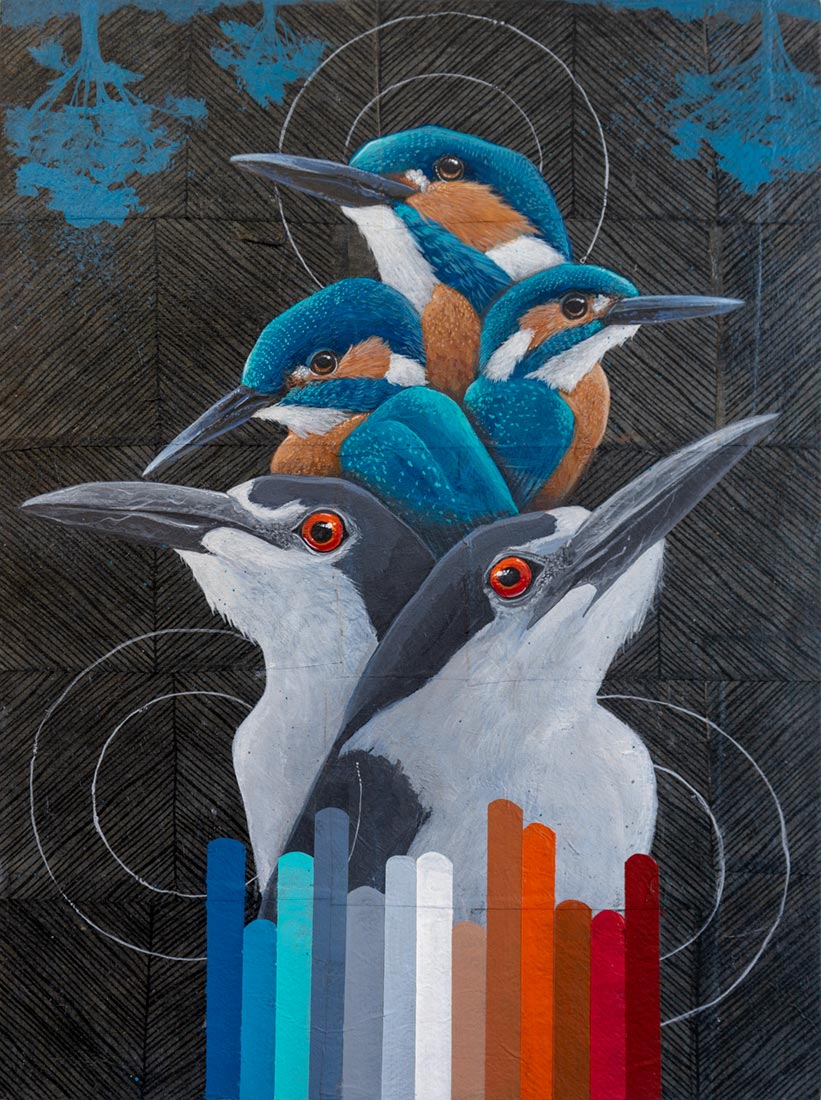 Joshua Coffy was born in 1976 in Tuscarawas, Ohio. He is a self taught artist who works primarily in acrylic paints. The artists fuses vibrant colors with mixed media to create a sense of depth and juxtaposition in his artworks. His subject matter deals almost exclusively with the animal kingdom, making statements about the connection between man and beast. He now lives and works in San Francisco.