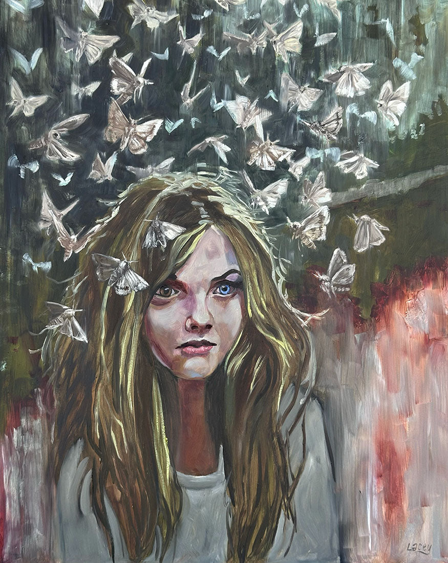 • Lacey Bryant is a painter based in the San Francisco Bay Area, where she works from her studio almost every day. Her evocative oil paintings explore quiet, haunting narratives that unfold between her subjects. Blending nostalgic sweetness with hints of darkness and mystery, her work invites viewers into a surreal world just beyond the familiar.
