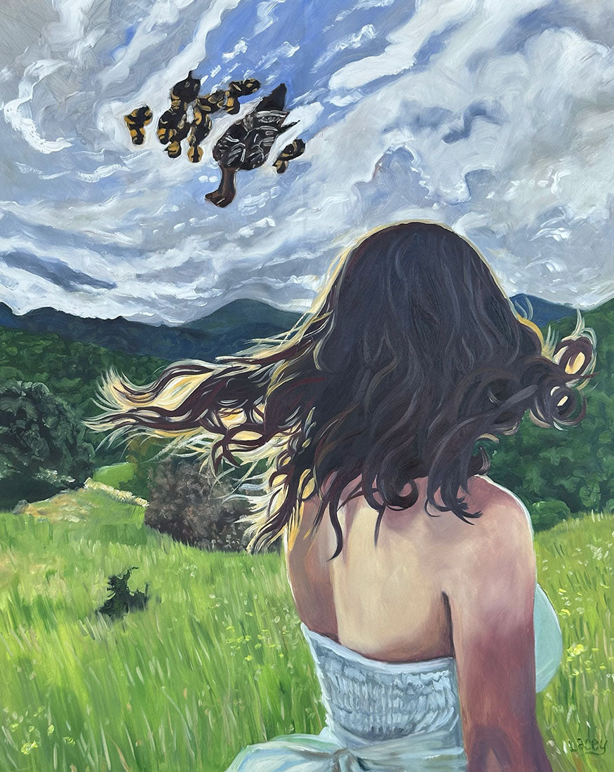 • Lacey Bryant is a painter based in the San Francisco Bay Area, where she works from her studio almost every day. Her evocative oil paintings explore quiet, haunting narratives that unfold between her subjects. Blending nostalgic sweetness with hints of darkness and mystery, her work invites viewers into a surreal world just beyond the familiar.