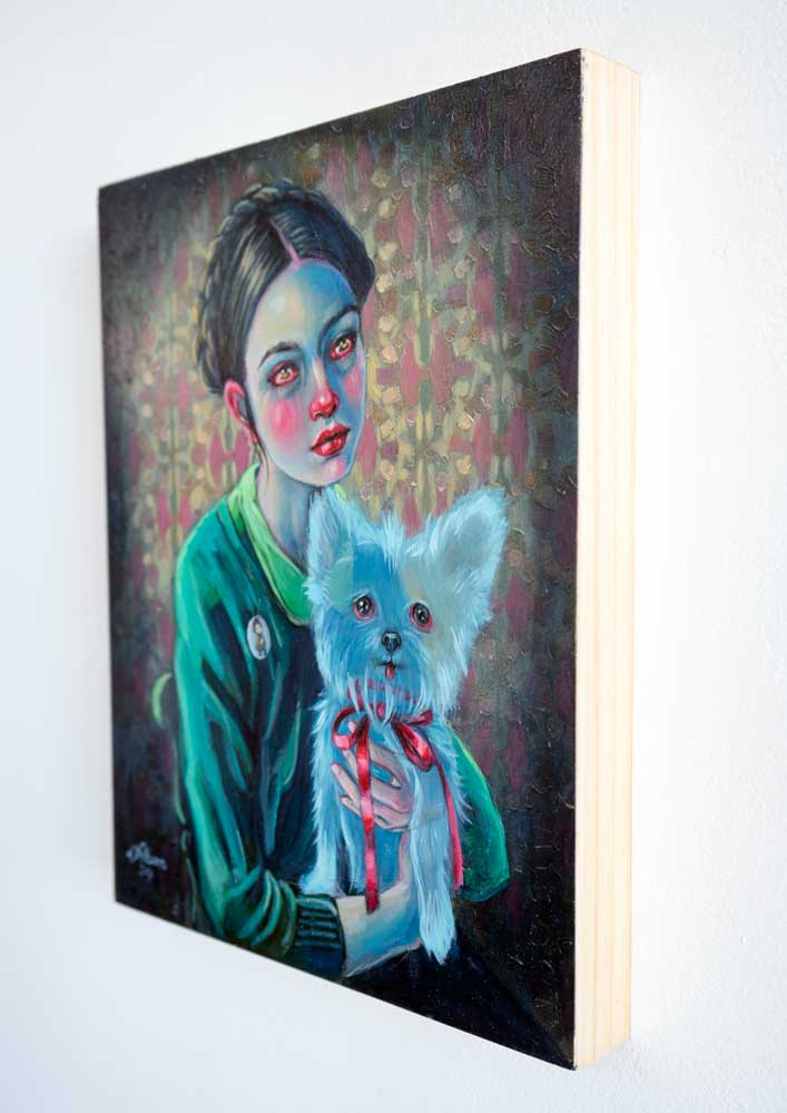 This summer we almost lost our dog to a coyote attack. My daughter was instrumental in saving his life. This is the inspiration for this painting, as we all imagined the unimaginable: losing our pup. We know someday this painting will be depict a reality, but for now, it is only a bittersweet imagining of that sad day.