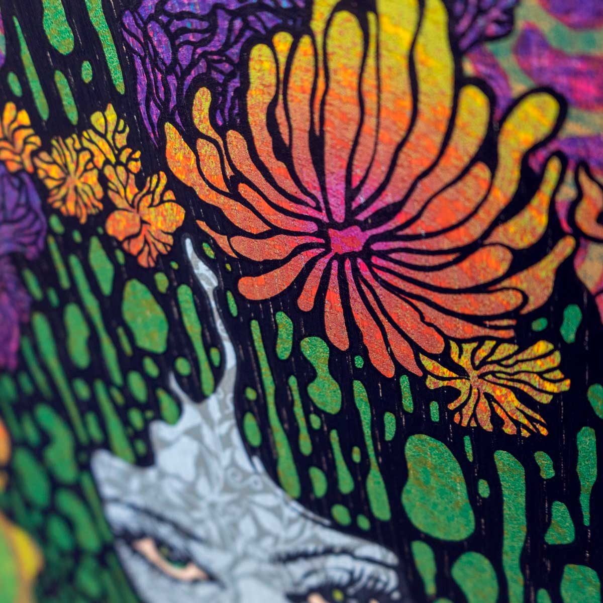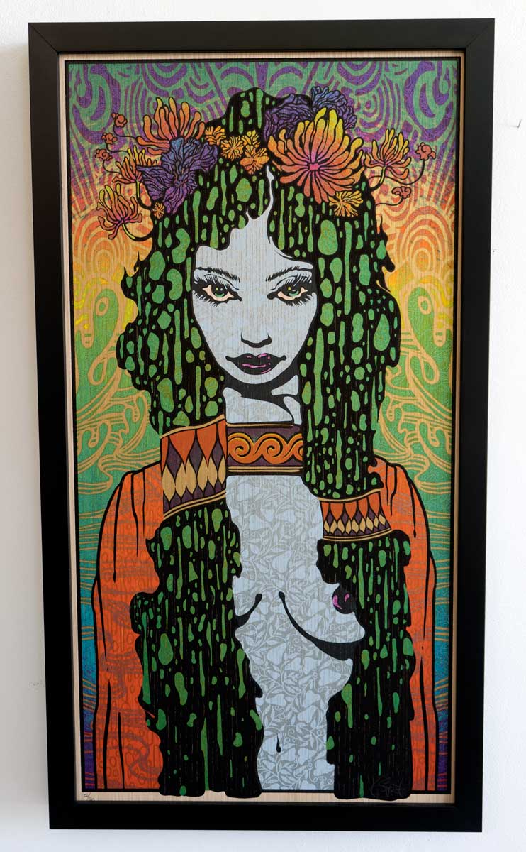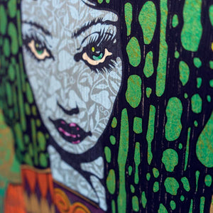 Originally produced in 2015 as a screenprint on paper for the ocean environmental activist foundation Pangea Seed, my latest print on oak panel, “Siren”, is meant as a warning. My imagination has always been drawn to this mythical being – dangerous and enchanting – whose form is an enthralling warning. The Siren dances and sings like the sea itself, seducing us with her sound, movement and beauty.
