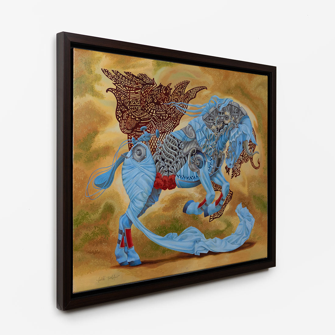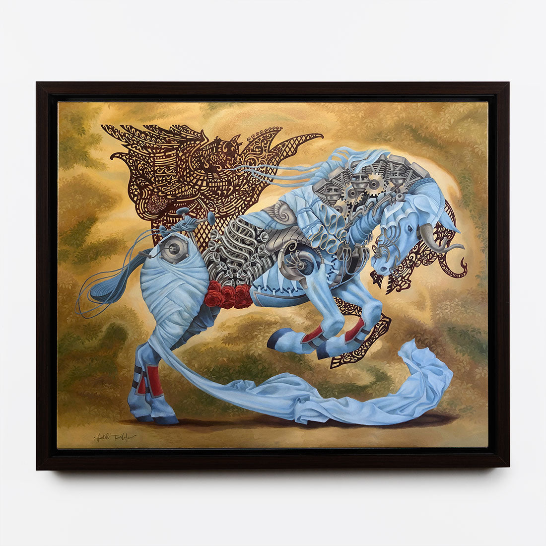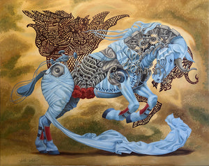 Her paintings often depict subjects comprised of seemingly incongruous objects characterized as symbolic, which form a complex composite of elements and add a contemporary spin to often classical icons. Taillefer's work highlights our growing hybridization with technology, in which she depicts “machine-like” constructions. Her approach is to infuse primordial aspects of the human condition into these hybridized humans and animals, and seeks to remind the viewer of the inescapable nature of our being despite our increasing merger with technology.