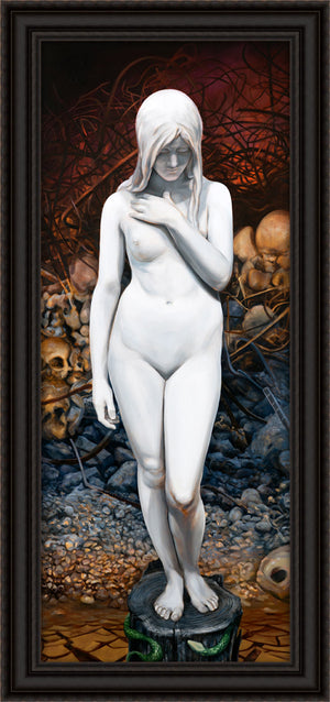Bradley Platz’ intricate oil paintings deal with the alternating nature of worship in the modern age. The artist reinterprets classical imagery from old world traditions, myths, and allegories. A lover of museums, he is inspired by the effect of time on marble sculpture. His work visually describes our transition from classical ideals to modern individualism and nature capitalism. He lives and works in San Francisco, CA and is the cofounder of Modern Eden Gallery.