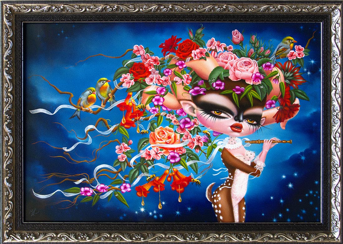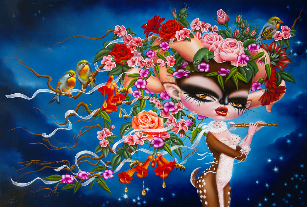 Marie Larkin is an Australian Pop Surrealist. Her art embodies an undeniably feminine oeuvre, meticulous execution and attention to detail. Works in painting, drawing and sculpture have been inspired by fairytale and nursery rhyme narratives, pop culture, beauty and the feminine persona.. She creates richly coloured, finely detailed, alternate worlds inhabited by beautiful girls, strange and mesmerising, with expressive eyes and dark natures. Most recently, female characters have an undeniable feminine force, strong, empowered and aloof. Her bodies of work continue to mature, gaining greater sophistication of style and consistency throughout.. Paintings and drawings retain her signature women who embue the works with narrative and emotional content.