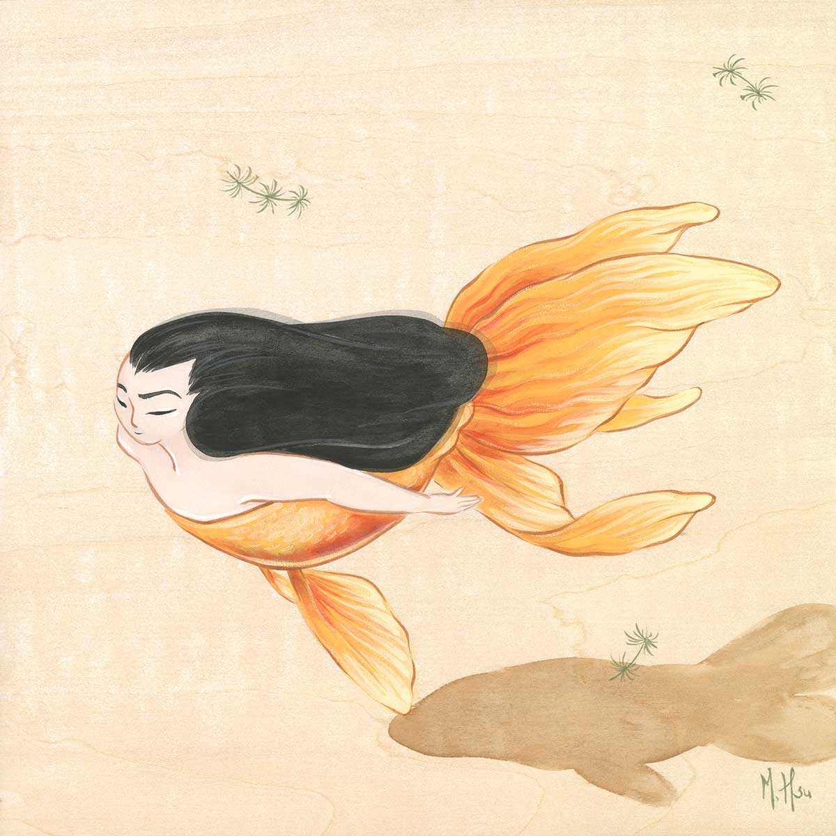 Modern Eden Gallery is thrilled to host San Francisco-based artist and illustrator Martin Hsu in the back gallery for Ningyo 人魚 (human fish). This new exhibit features an installation of new works of Hsu’s ephemeral creatures - the goldfish mermaid. The goldfish originated from the wild over 2000 years ago. They were kept by The Emperor as imperial treasures, raised by the rich and noble as valuable prizes, and closely guarded for their metallic scales - a symbol of good fortune and prosperity. Martin Hsu’s goldfish mermaids are a personification of these auspicious keepings. They are great maternal spirits in our lives, blessed with grace and strength, looking after the past, present, and beyond. The mermaids exist neither in air nor water, but in a quiet place Martin refers to as metta - a place within ourselves filled with benevolence, warmth, and loving-kindness. It’s where goodwill flourishes and happiness resides.