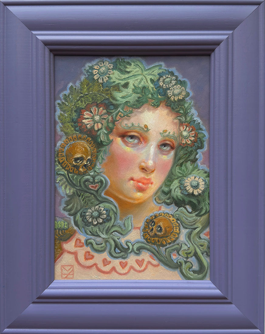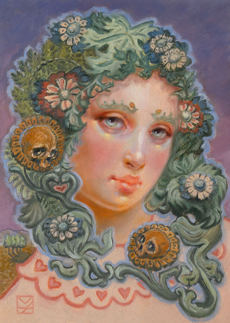 Meg Allan works in oil, graphite and charcoal and prefers to work in a layered, detailed manner. Forever a classical painting enthusiast, with strong influences from Bouguereau and Waterhouse, Meg’s work is steeped in layers of symbolism, myth, prose and spirituality.
