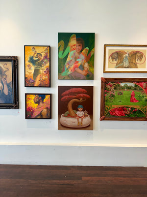 The works of Mr. S (b. 1990) are steeped in the world of fantasy. Complete with a dreamlike environment and wide-eyed characters, he is not only technically skilled, but also gifted with the vision to construct imaginary, bordering on surreal, scenes. His characters can often be found on an adventure, accompanied by larger-than-life creatures. Such talent in world-building and character design only comes natural for Mr. S, who did works in video and film before becoming a visual artist.