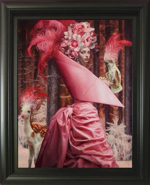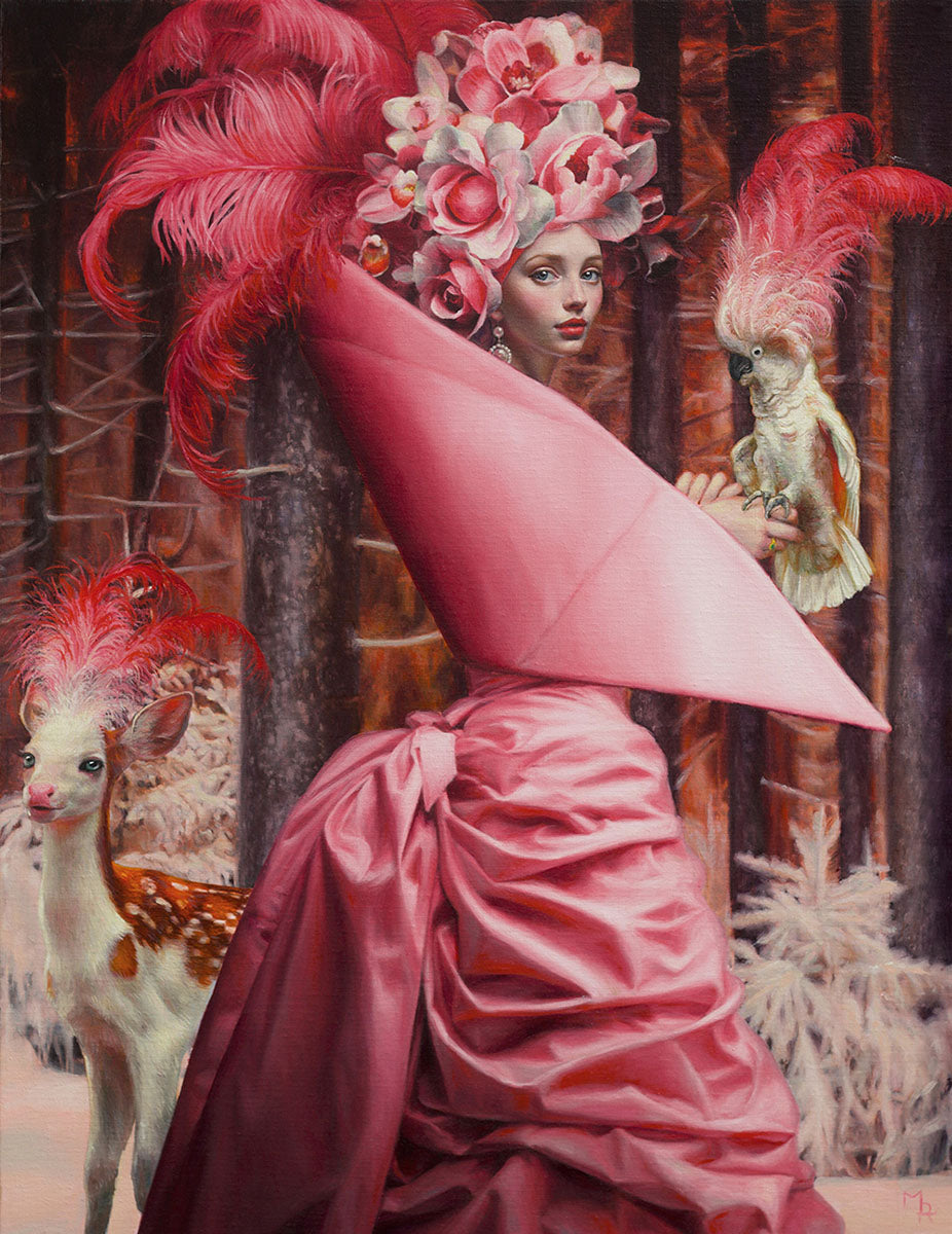 Marc Le Rest’s oil paintings evolve like fashion collections, mixing the raw nature of the animal kingdom with culturally-rooted fabric hats and outfits. Le Rest takes his former background as a textile designer to the collections of Hermès, Armani, and Gaultier and incorporates his expertise into his fantastical “lace zoo” creations.