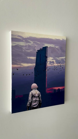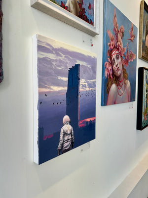 Scott Listfield (b. 1976, Boston, MA) is known for his paintings featuring a lone exploratory astronaut lost in a landscape cluttered with pop culture icons, corporate logos, and tongue-in-cheek science fiction references. Scott studied art at Dartmouth College, for which his parents have finally forgiven him. After some time spent abroad, Scott returned to America where, a little bit before the year 2001, he began painting astronauts and, sometimes, dinosaurs.