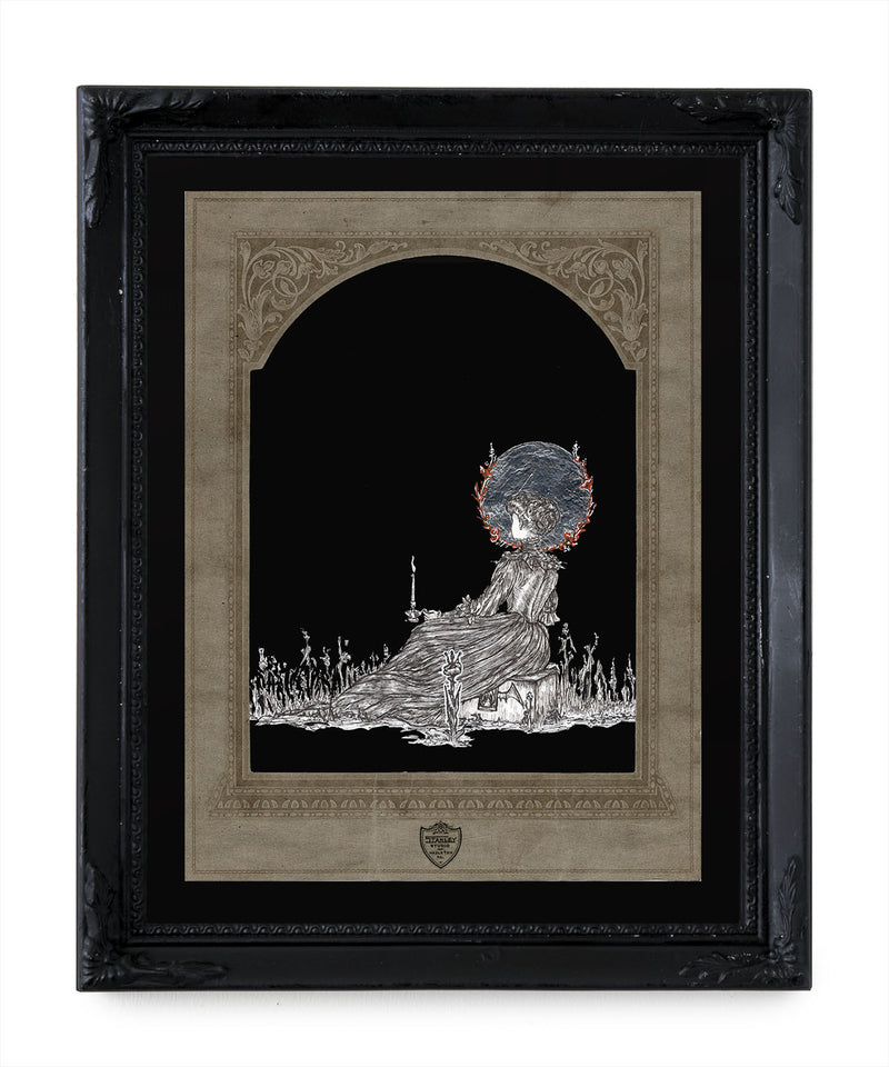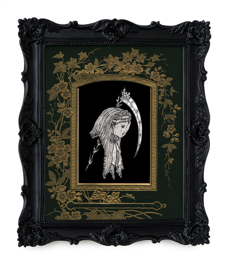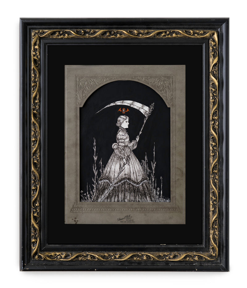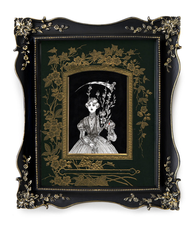 The Reaper in the Meadow is a new series of pen and ink works on themes of Victorian nostalgia, folklore, costume, and ritual. Adorned in decorative frames and antique scrollwork mats, each piece is more unique than the last.