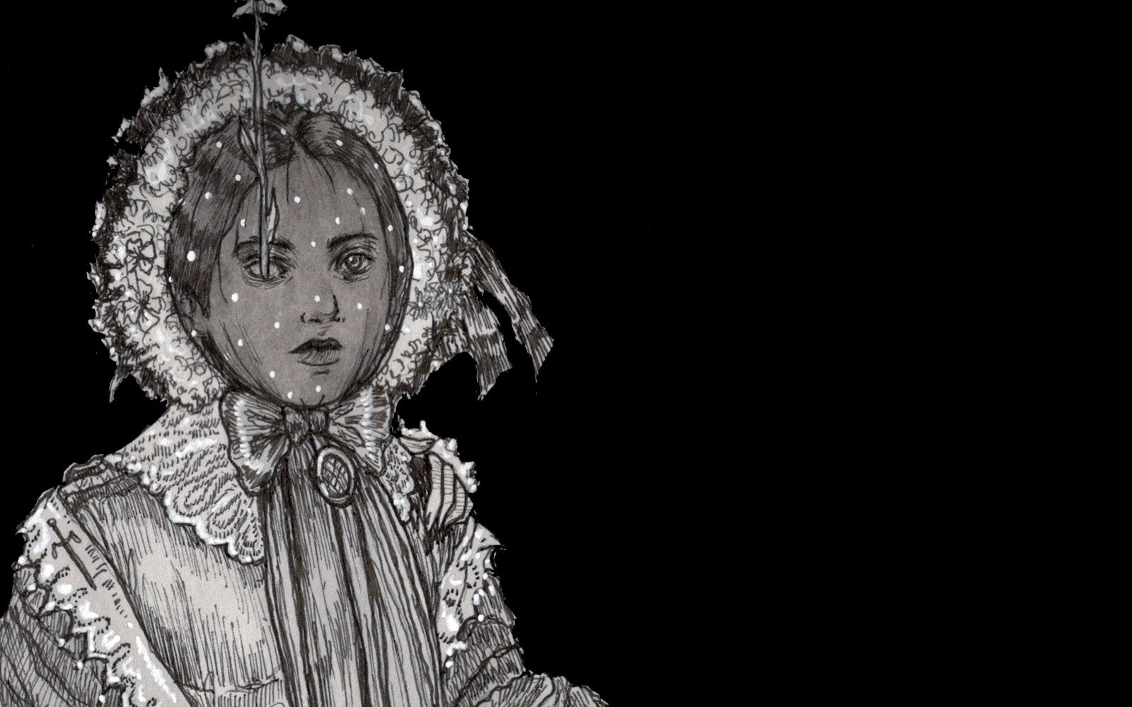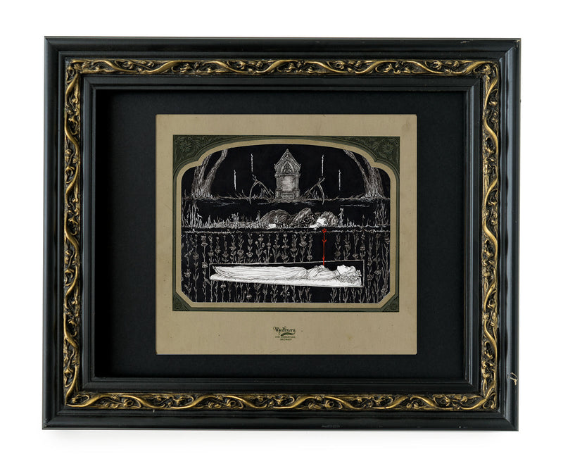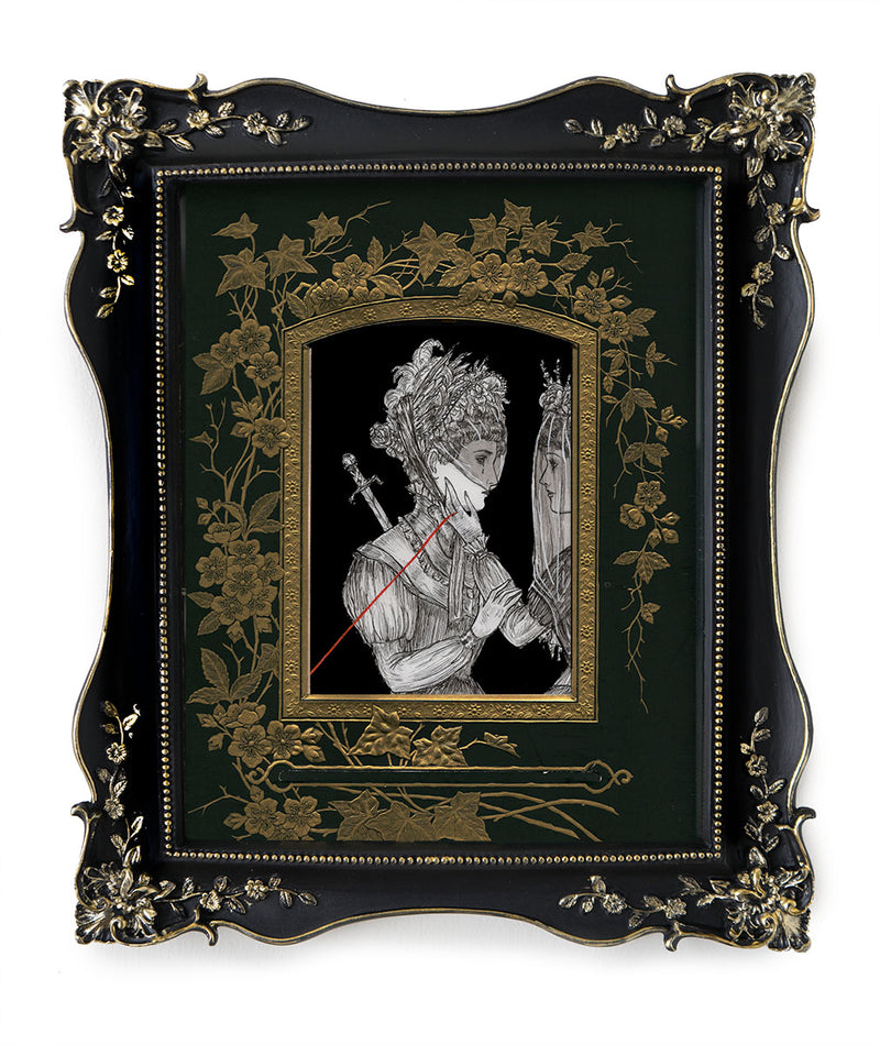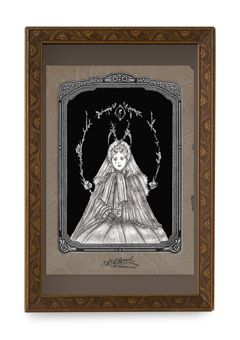 The Reaper in the Meadow is a new series of pen and ink works on themes of Victorian nostalgia, folklore, costume, and ritual. Adorned in decorative frames and antique scrollwork mats, each piece is more unique than the last.