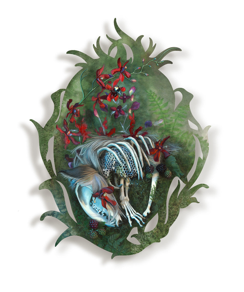 • Modern Eden Gallery is pleased to present Exquisite Corpse, a solo exhibition of new paintings by Seattle-based artist Redd Walitzki. Redd Walitzki returns to the gallery with a series rooted in the transformation of decay into new life. These paintings explore the relationship between entropy and new growth; they pull at the petal edges of our fascination with death and the tragic muse. The line between the inert and transformed is not always clear in Walitzki's new work, where translucent flesh turns to foliage, and flora becomes fauna. These lush and swirling paintings feature figures sprouting flowers, salamanders bursting into flame, and animals decaying into fresh blossoms. Intricately shaped frames likewise reclaim life from hardened immobility, as their baroque and curling laser cut forms seek purchase on the gallery walls.