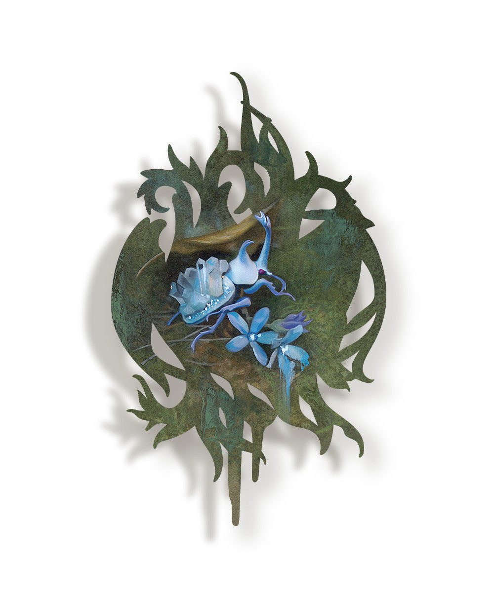 • Modern Eden Gallery is pleased to present Exquisite Corpse, a solo exhibition of new paintings by Seattle-based artist Redd Walitzki. Redd Walitzki returns to the gallery with a series rooted in the transformation of decay into new life. These paintings explore the relationship between entropy and new growth; they pull at the petal edges of our fascination with death and the tragic muse. The line between the inert and transformed is not always clear in Walitzki's new work, where translucent flesh turns to foliage, and flora becomes fauna. These lush and swirling paintings feature figures sprouting flowers, salamanders bursting into flame, and animals decaying into fresh blossoms. Intricately shaped frames likewise reclaim life from hardened immobility, as their baroque and curling laser cut forms seek purchase on the gallery walls.