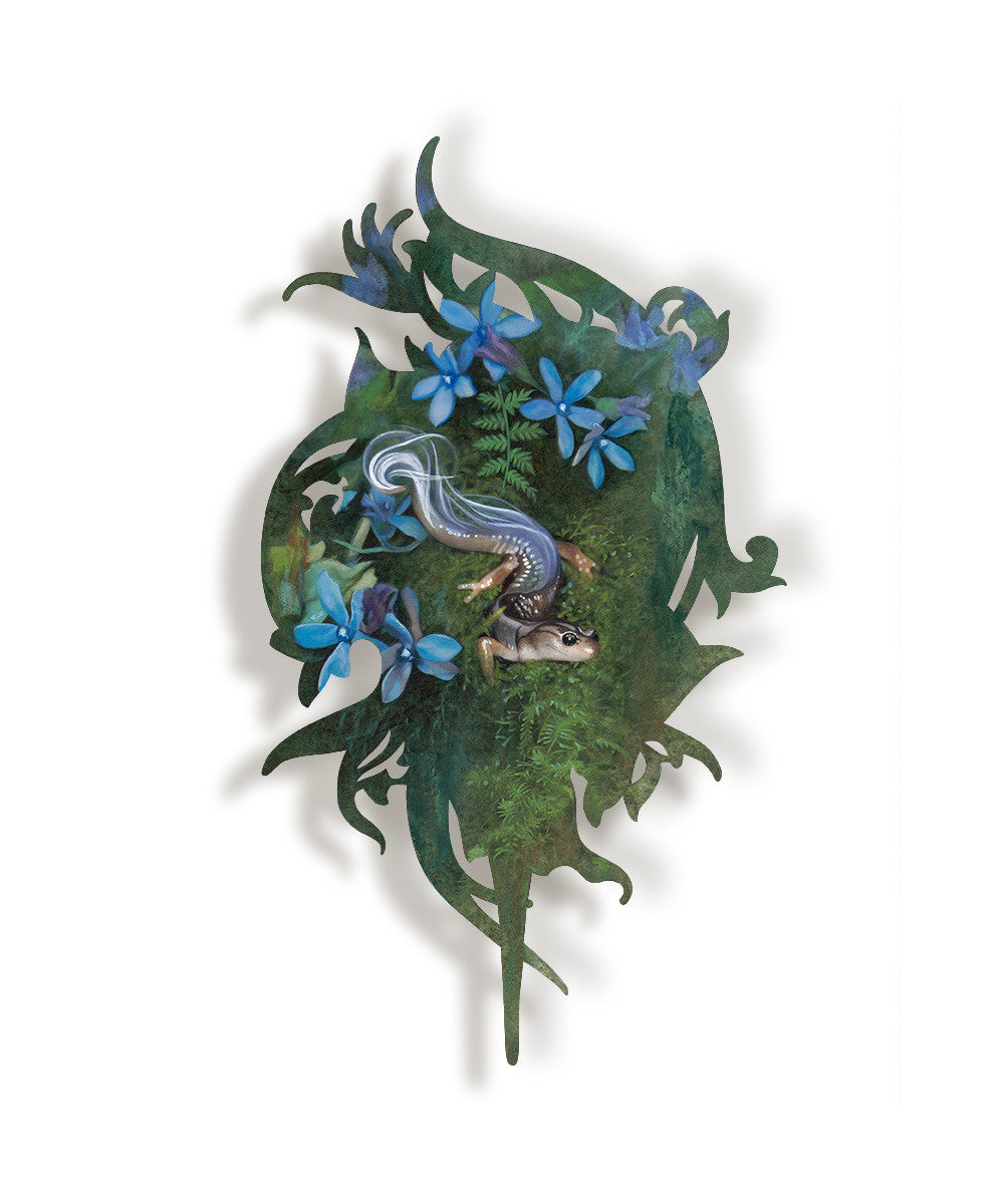 • Modern Eden Gallery is pleased to present Exquisite Corpse, a solo exhibition of new paintings by Seattle-based artist Redd Walitzki. Redd Walitzki returns to the gallery with a series rooted in the transformation of decay into new life. These paintings explore the relationship between entropy and new growth; they pull at the petal edges of our fascination with death and the tragic muse. The line between the inert and transformed is not always clear in Walitzki's new work, where translucent flesh turns to foliage, and flora becomes fauna. These lush and swirling paintings feature figures sprouting flowers, salamanders bursting into flame, and animals decaying into fresh blossoms. Intricately shaped frames likewise reclaim life from hardened immobility, as their baroque and curling laser cut forms seek purchase on the gallery walls.