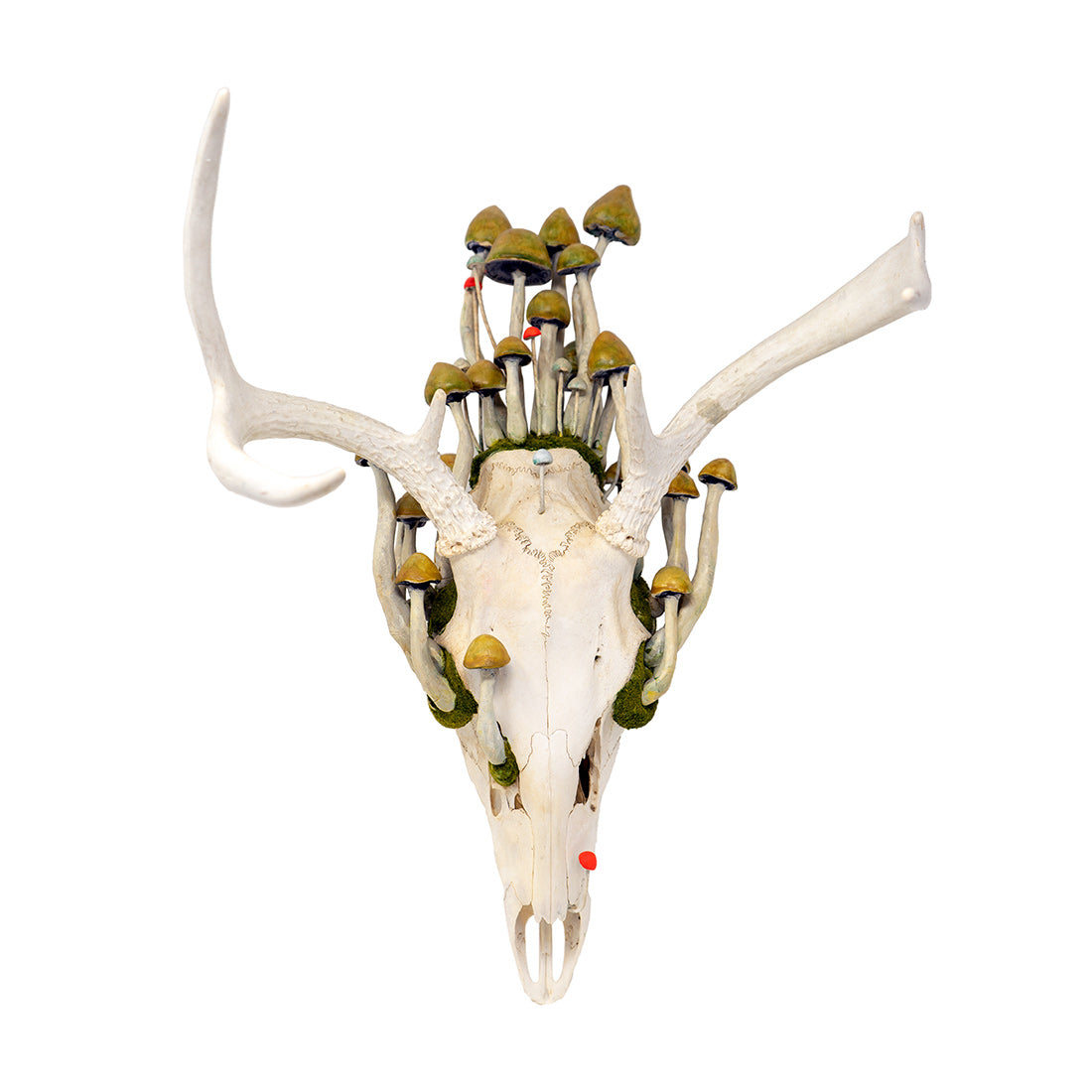 • Deer Skull, Epoxy, Acrylic, Flock, and Gold Leaf