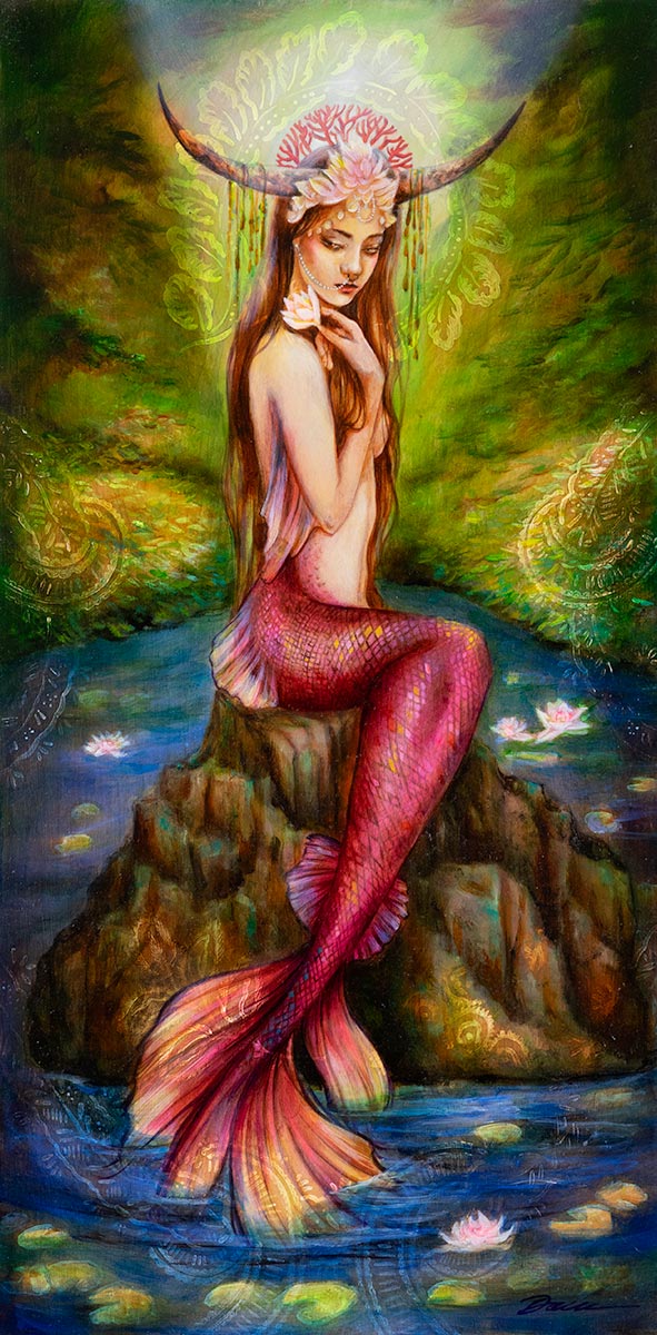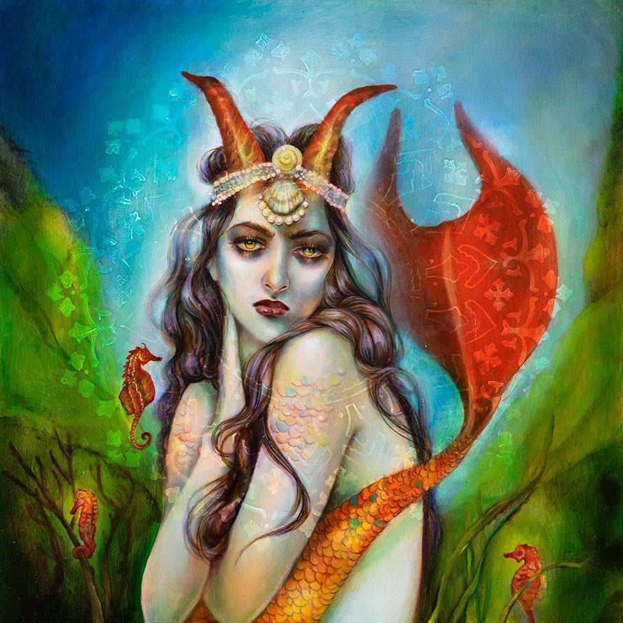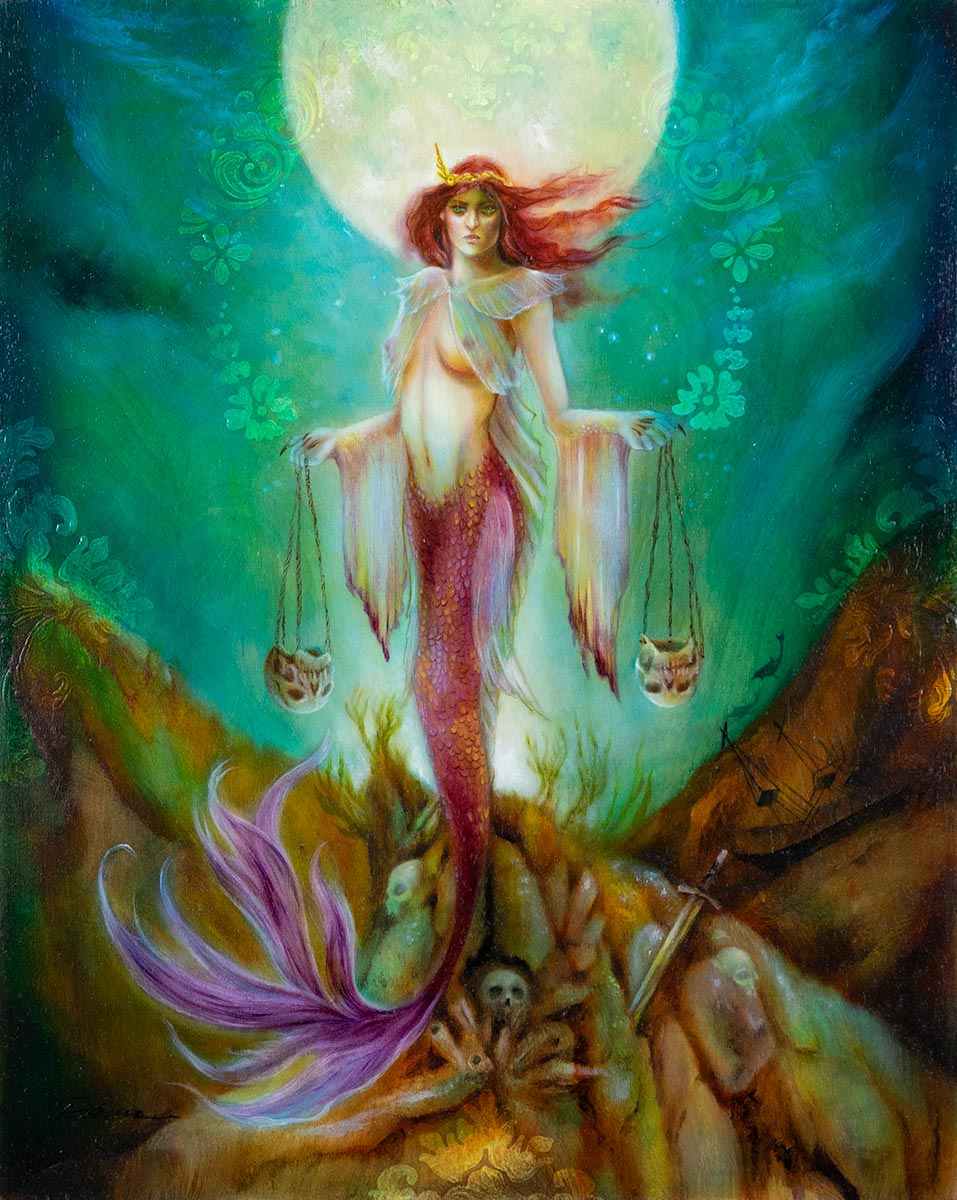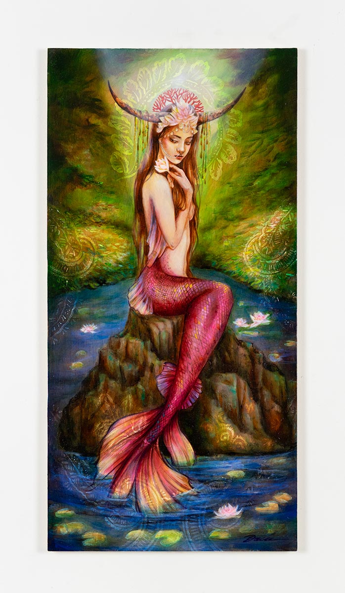 Modern Eden Gallery proudly presents the gallery debut solo exhibition from longtime gallery artist Lara Dann. Lara Dann is a talented American artist who creates amazing paintings that depict fantastical figures in the midst of contrasting themes – such as light and dark, lust and innocence, knowledge and naivete. Her work is inspired by vintage and antique wallpaper tapestry which is featured in most of her underlying work. Her long-awaited series, Sirens of the Zodiac presents 16 new oil paintings in her signature style featuring mermaids for every sign of the zodiac and elements of astrology.