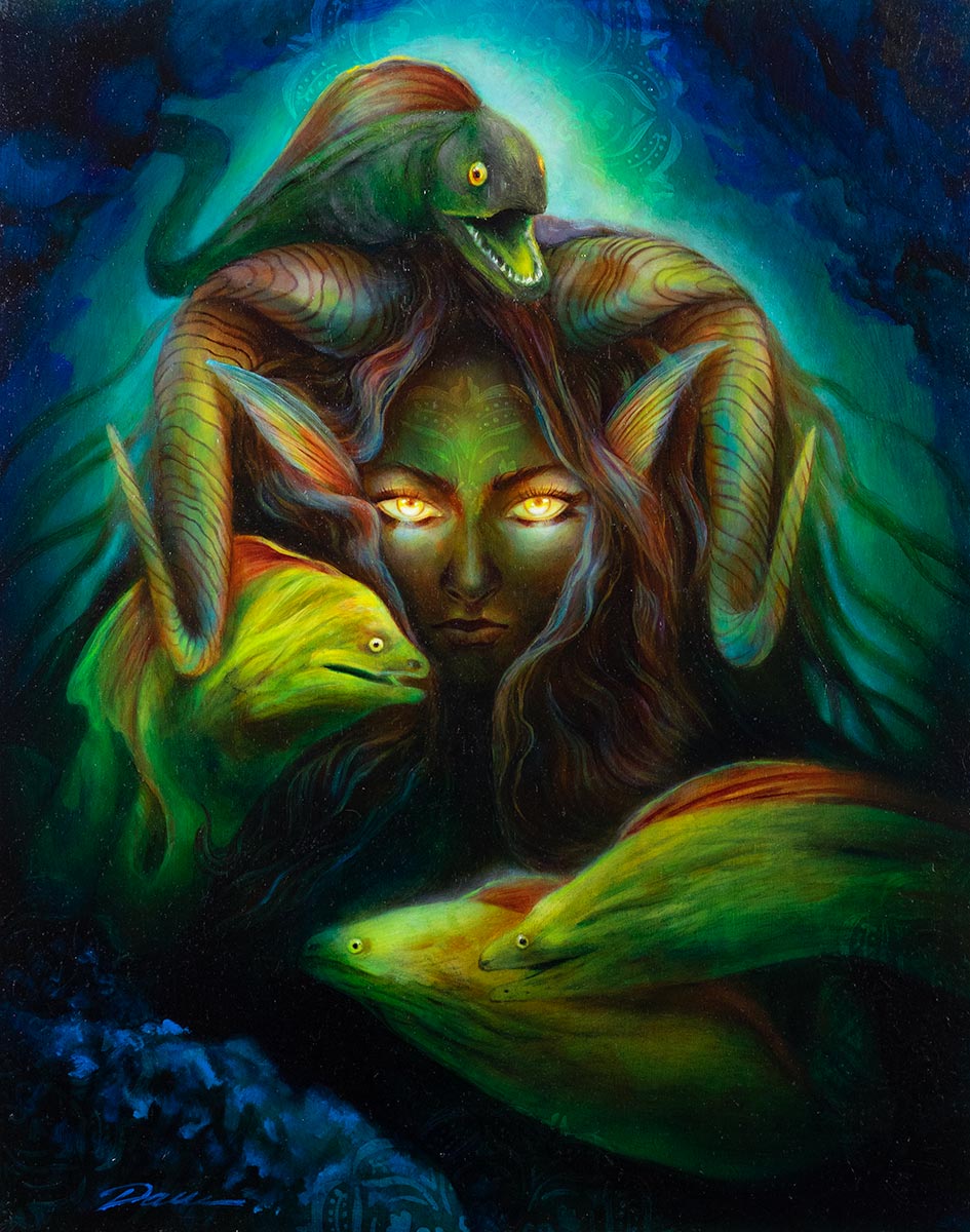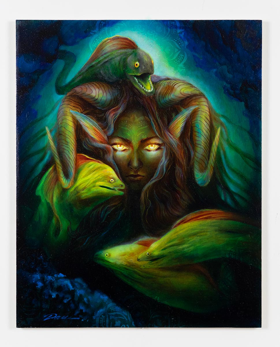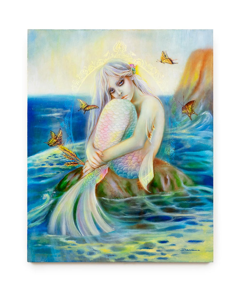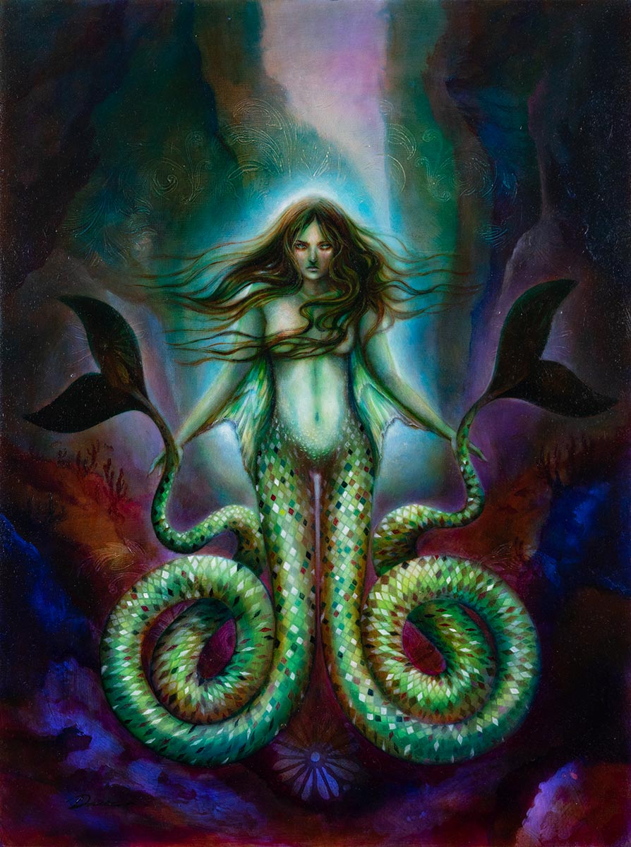Modern Eden Gallery proudly presents the gallery debut solo exhibition from longtime gallery artist Lara Dann. Lara Dann is a talented American artist who creates amazing paintings that depict fantastical figures in the midst of contrasting themes – such as light and dark, lust and innocence, knowledge and naivete. Her work is inspired by vintage and antique wallpaper tapestry which is featured in most of her underlying work. Her long-awaited series, Sirens of the Zodiac presents 16 new oil paintings in her signature style featuring mermaids for every sign of the zodiac and elements of astrology.