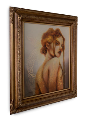Lara Dann is an American artist who creates paintings that depict fantastical figures in the midst of contrasting themes – such as light and dark, lust and innocence, knowledge and naivete. Her work is inspired by vintage and antique wallpaper tapestry which is featured in most of her underlying work. Lara Dann's gallery debut solo exhibition at Modern Eden Gallery was in 2020, entitled 'Sirens of the Zodiac' followed up by 2021's 'Dark Embrace'.