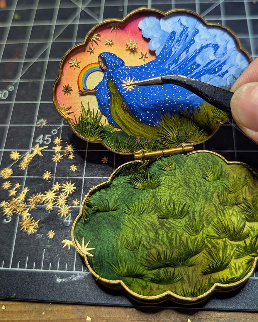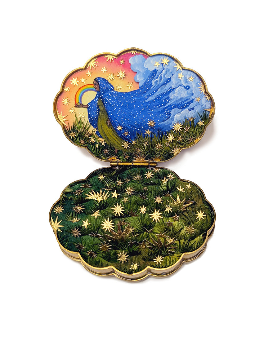 A highly prolific artist, Taylor has developed a style of watercolor that is distinctly her own, utilizing rich colors, layers of blending, dry-brushing, and pattern work, Taylor is constantly pushing and expanding on the possibilities of the medium. Often conjuring the decorative and figurative qualities of the Pre-Raphaelite Brotherhood and aesthetic movement, Taylor’s work is an exploration of beauty. In her paintings, heavy indigo skies are filled with stars, and flowers bloom from the backs of languid, lovely women, and tiny worlds can be held in your hand; the world that Taylor has made is gilt, prismatic, and lovingly wrought.