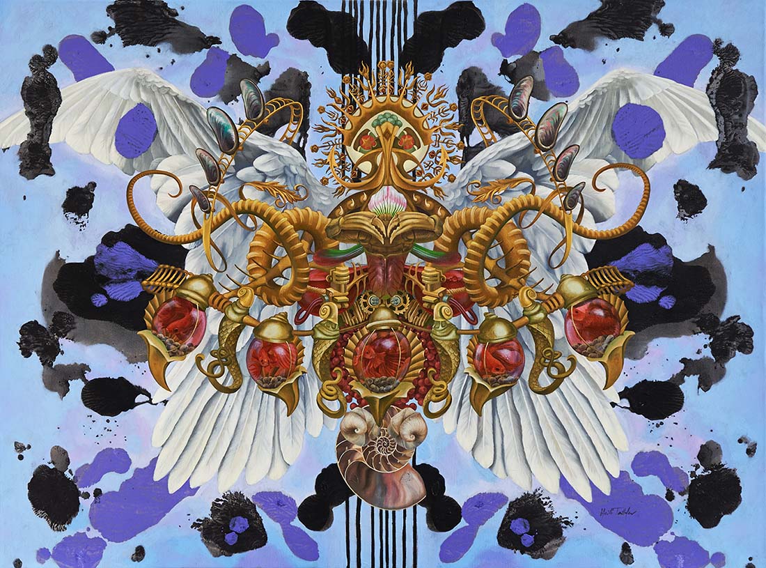 Her paintings often depict subjects comprised of seemingly incongruous objects characterized as symbolic, which form a complex composite of elements and add a contemporary spin to often classical icons. Taillefer's work highlights our growing hybridization with technology, in which she depicts “machine-like” constructions. Her approach is to infuse primordial aspects of the human condition into these hybridized humans and animals, and seeks to remind the viewer of the inescapable nature of our being despite our increasing merger with technology.