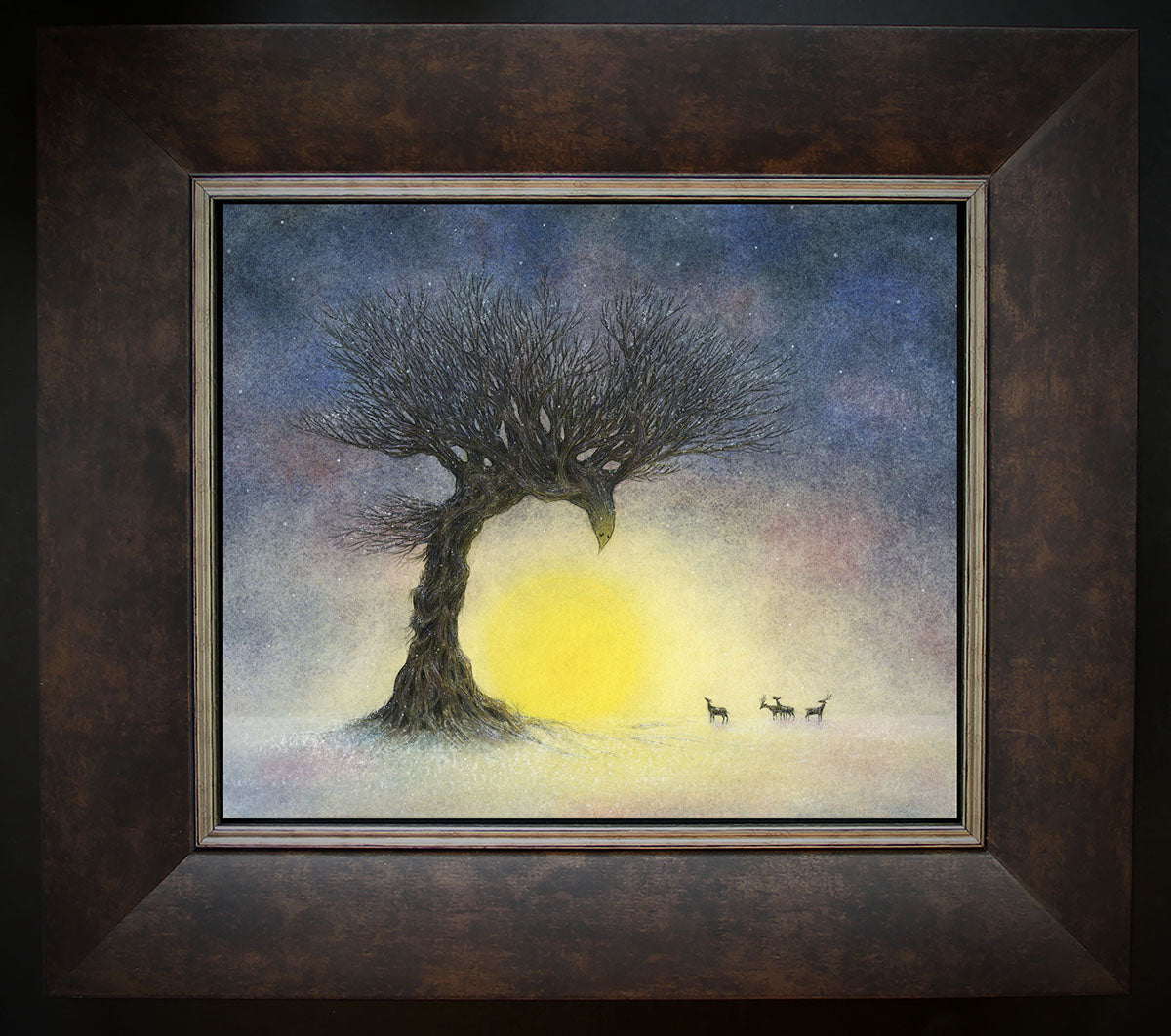 Jeannie L Paske is a self-taught artist from Portland, Oregon who creates introspective work under the name Obsolete World. Using a mix of watercolor, charcoal, pastel, graphite, varnish and ink, she designs richly textured illustrations of peculiar creatures in thought-provoking settings. The mysteries of life, loss and loneliness are reoccurring themes, and her compositions often focus on the strange and unexplained. Many of her pieces reference philosophy with a nod to both the melancholy and humorous. Her soft sparse environments suggest a warm, dreamlike state, and the emotional imagery paired with her poetic titles help to convey a sense of gentle curiosity in her work.