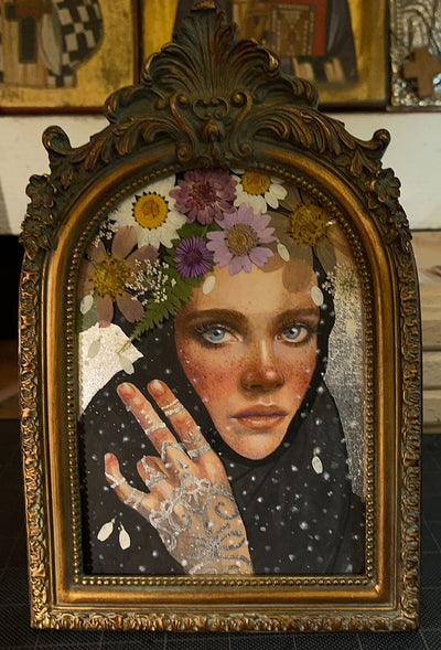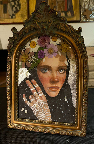 • Watercolor, colored pencil, silver leaf, pressed flowers on Arches Watercolor paper