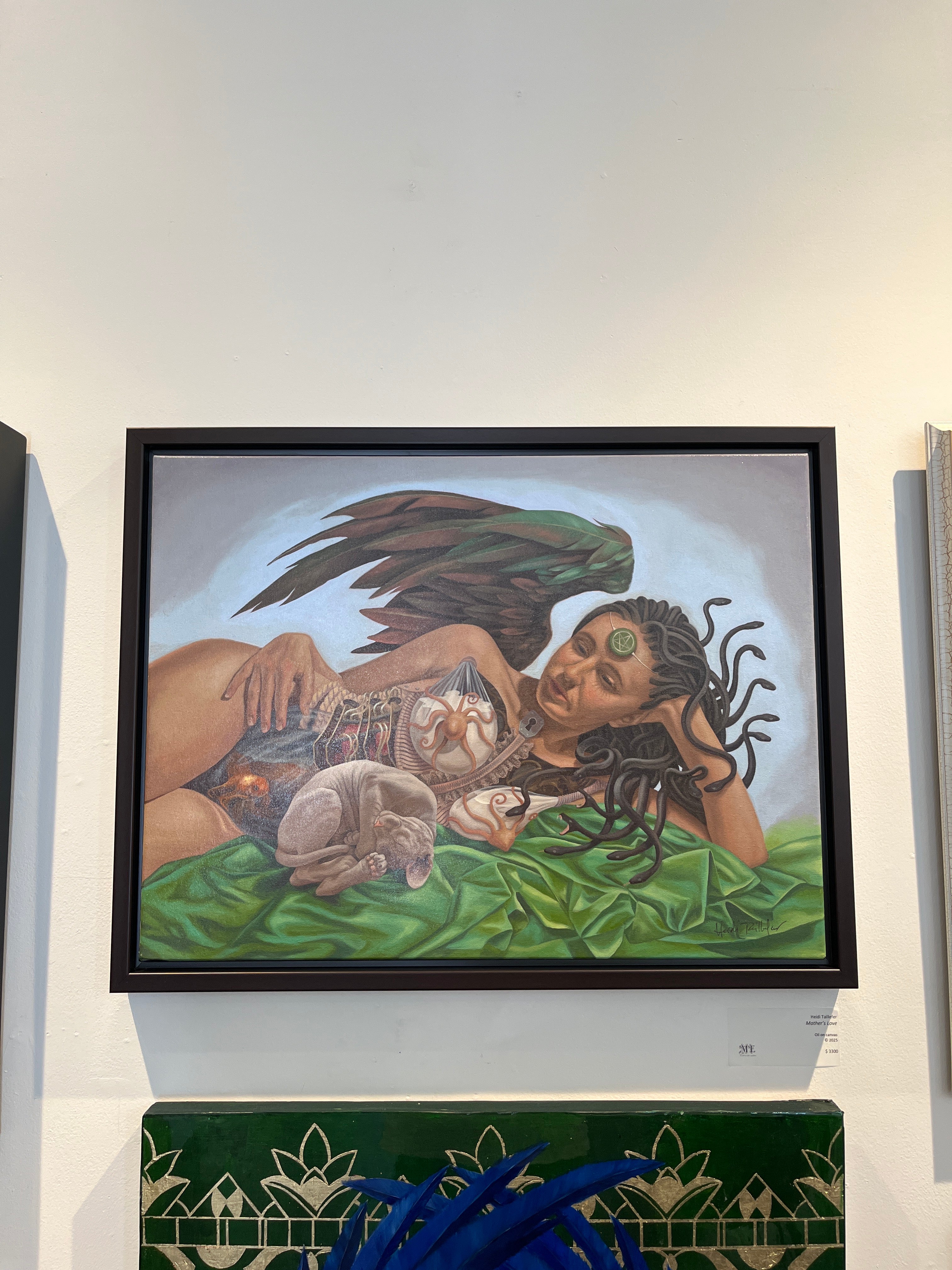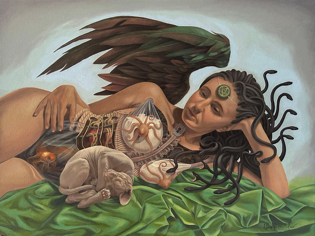 Her paintings often depict subjects comprised of seemingly incongruous objects characterized as symbolic, which form a complex composite of elements and add a contemporary spin to often classical icons. Taillefer's work highlights our growing hybridization with technology, in which she depicts “machine-like” constructions. Her approach is to infuse primordial aspects of the human condition into these hybridized humans and animals, and seeks to remind the viewer of the inescapable nature of our being despite our increasing merger with technology.