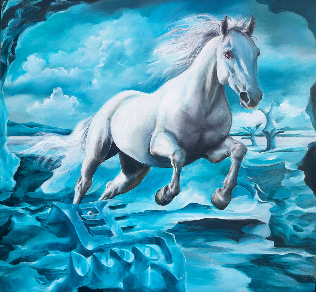 • Woman in a red dress standing next to a red horse with decorative cloud patterns on a gold background