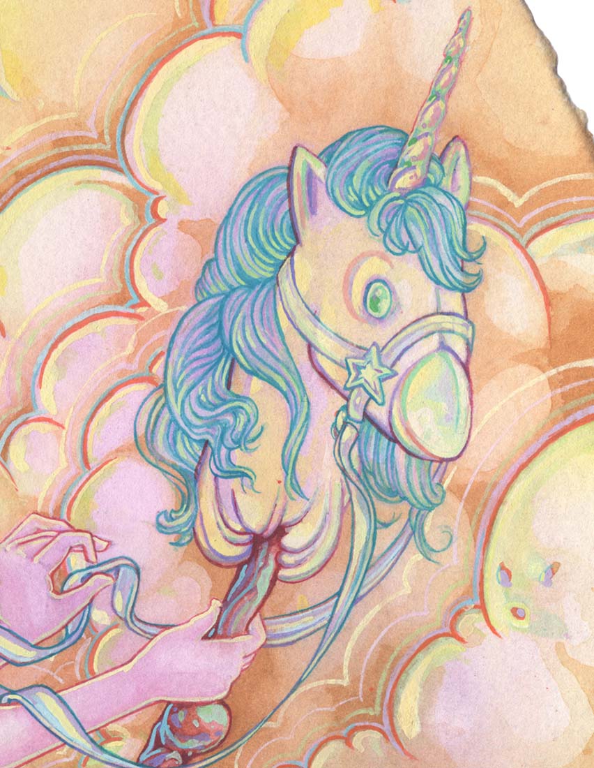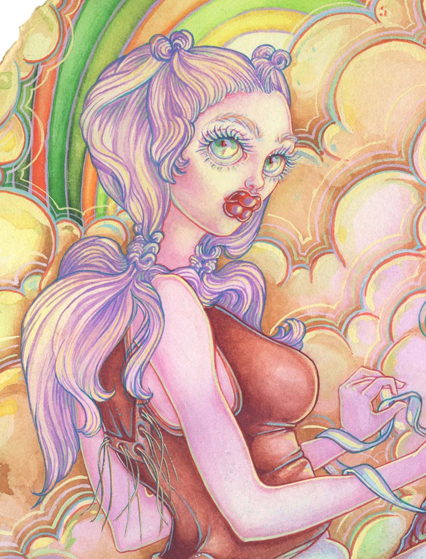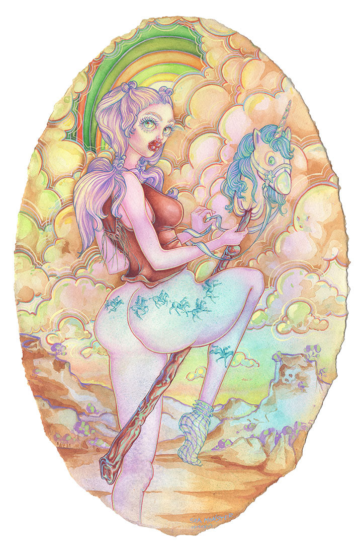 Sea Monster (b. 1982) is a Northern California–based watercolor artist whose work blends psychedelic color, fantastical portraiture, and a distinctly fluid sense of imagination. A graduate of California State University, Chico, where they earned a BFA, Sea Monster has cultivated a visual world that is both whimsical and otherworldly—alive with luminous palettes, melting shapes, and characters that straddle the line between dream and myth.
