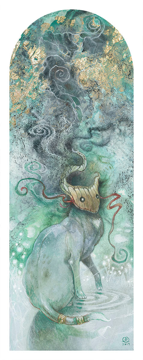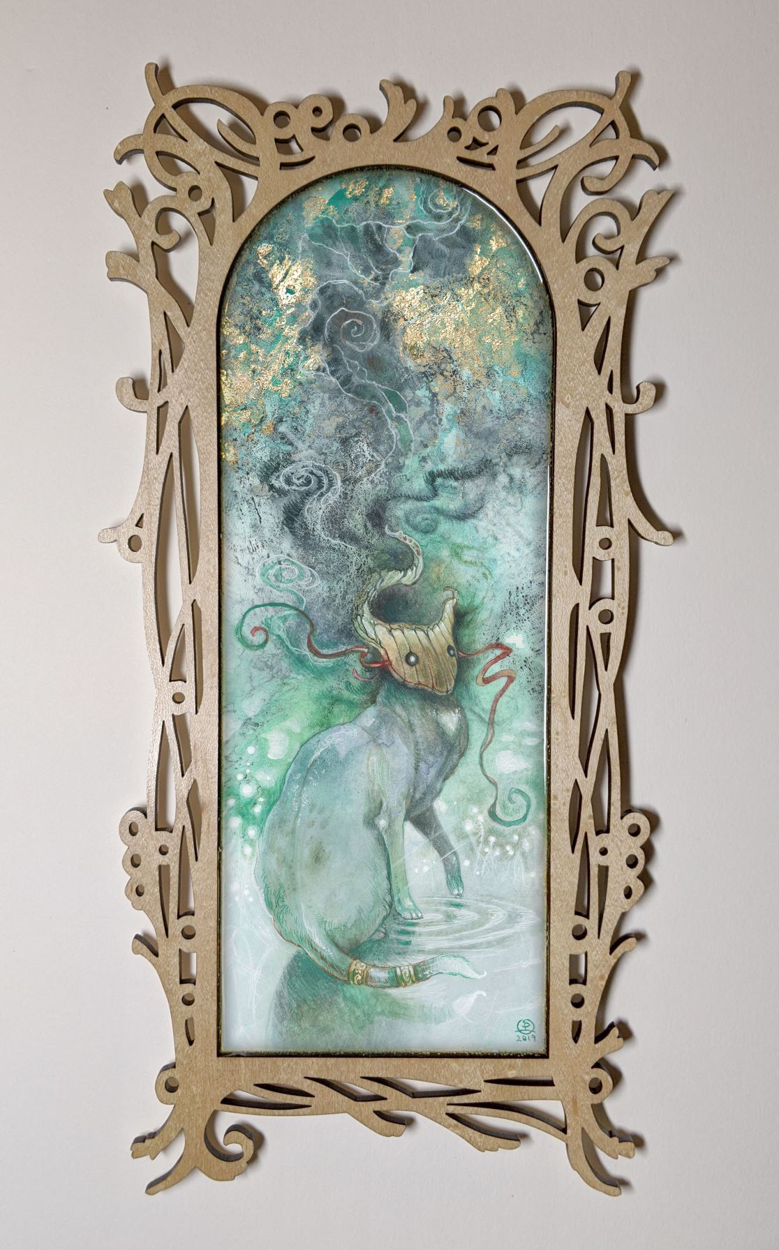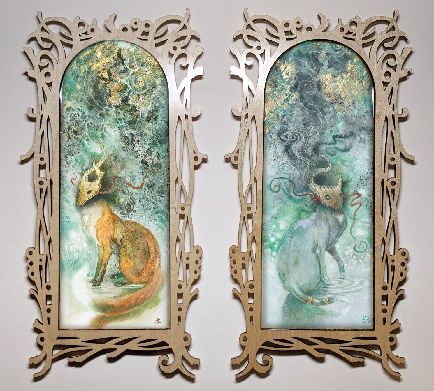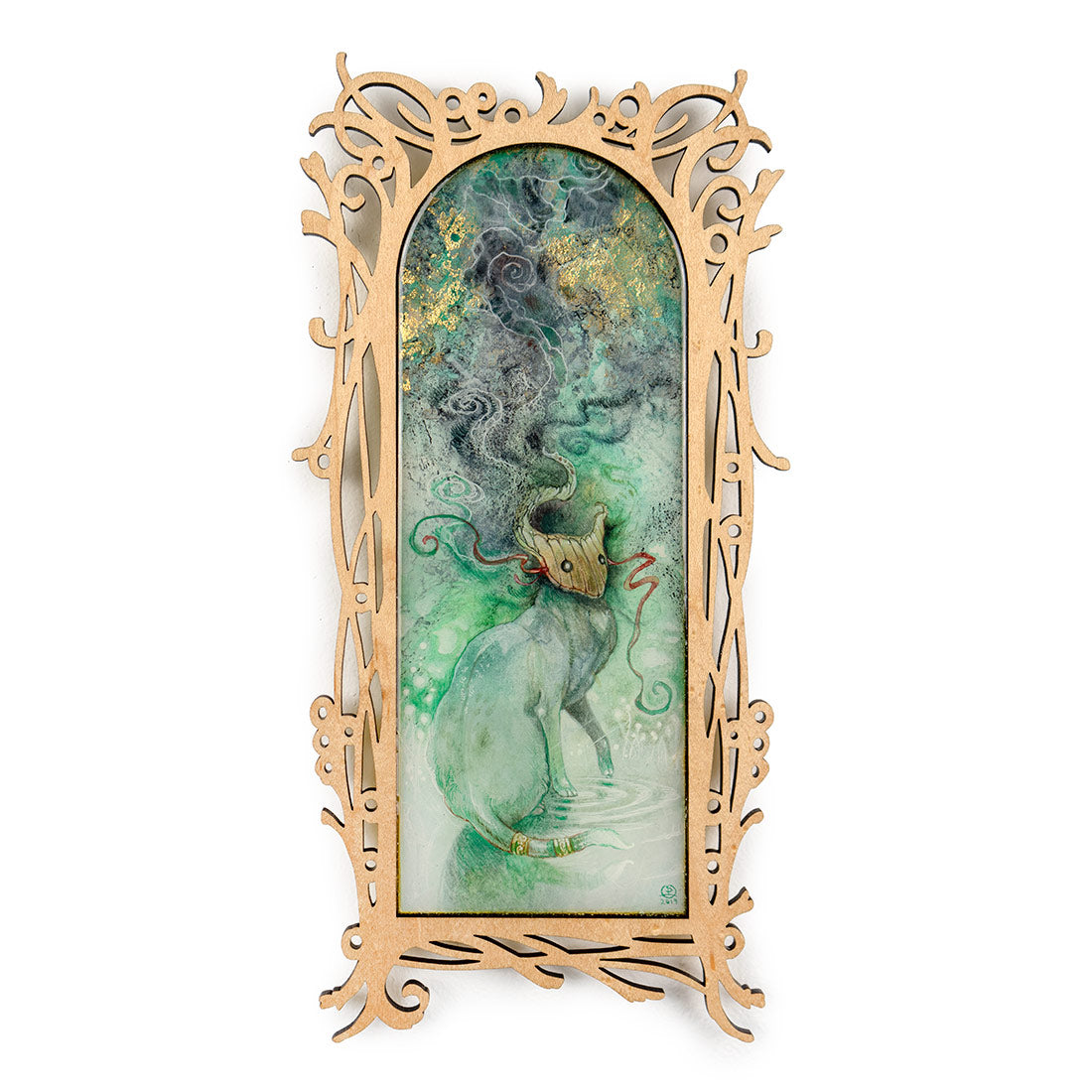 • Watercolor, gold & copper leaf, resin, wood