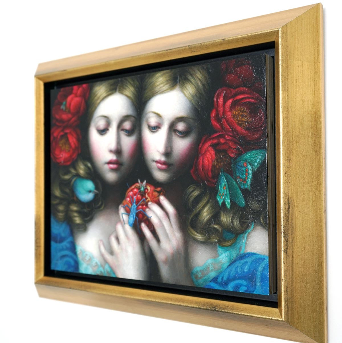 On the one hand, the brushstrokes and the luminosity of her panels are reminiscent of traditional Flemish paintings, in which the details, the quality of shading, and the softness of each character’s complexion are presented in a masterly manner. On the other hand, the subtle symbolism and compelling presence of the figures bring an unexpected air of accessible modernity.