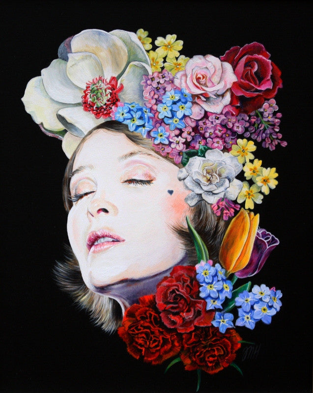 Her compositions feature darkly poetic female portraits against undefined backgrounds, in a void or dream-like state. These mystical portraits of women, almost haunting in their beauty, are seeped in the natural world, each work contains an element of the supernaturally surreal. They are contradictions within themselves, brought to sensual life through surrealistic icons & symbols. Each subject is attractive yet somehow disturbing.