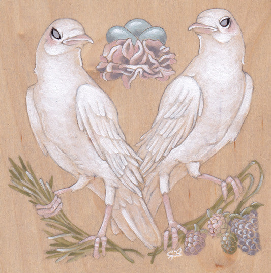 I wanted there to be a duel way of seeing the painting; the birds are both gazing lovingly at the eggs and fearlessly guarding them against predators. Poised on either side, they are ready to defend the young ones at all costs.