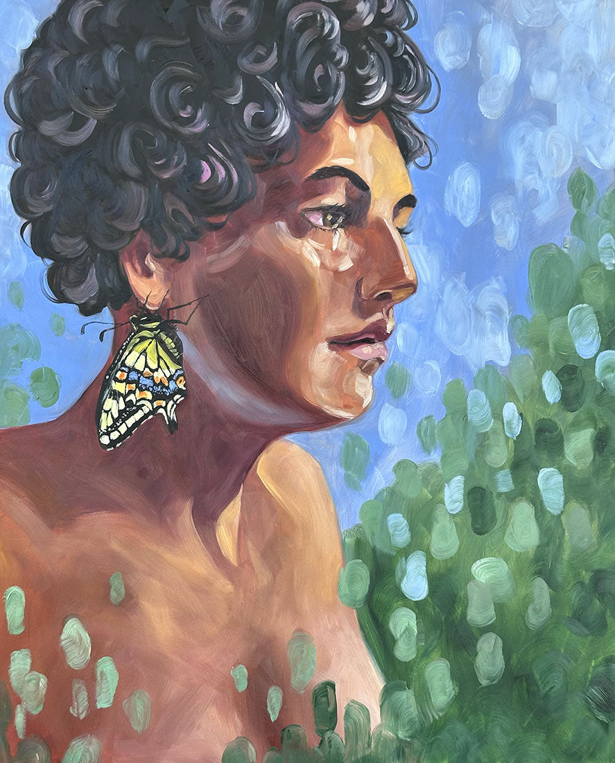 • Lacey Bryant is a painter based in the San Francisco Bay Area, where she works from her studio almost every day. Her evocative oil paintings explore quiet, haunting narratives that unfold between her subjects. Blending nostalgic sweetness with hints of darkness and mystery, her work invites viewers into a surreal world just beyond the familiar.