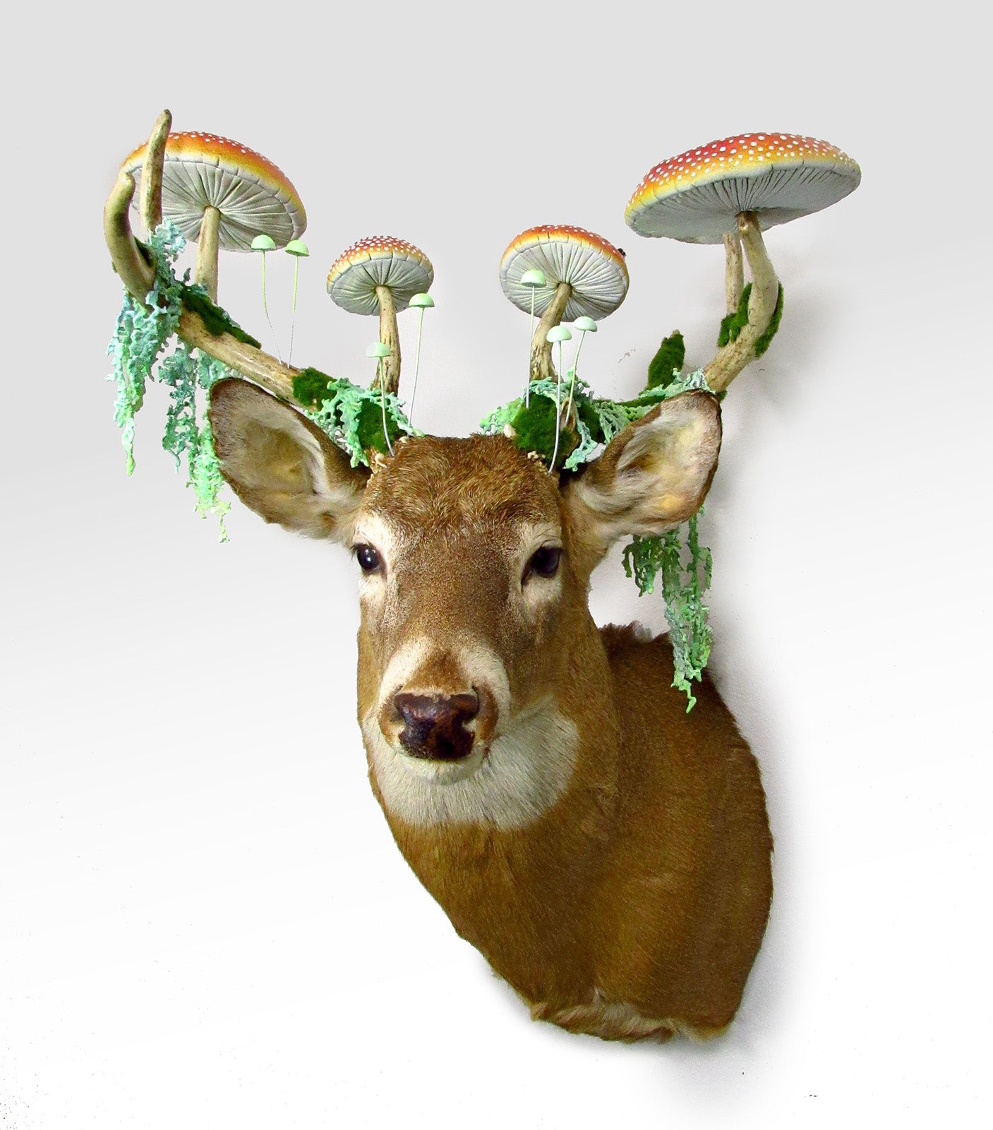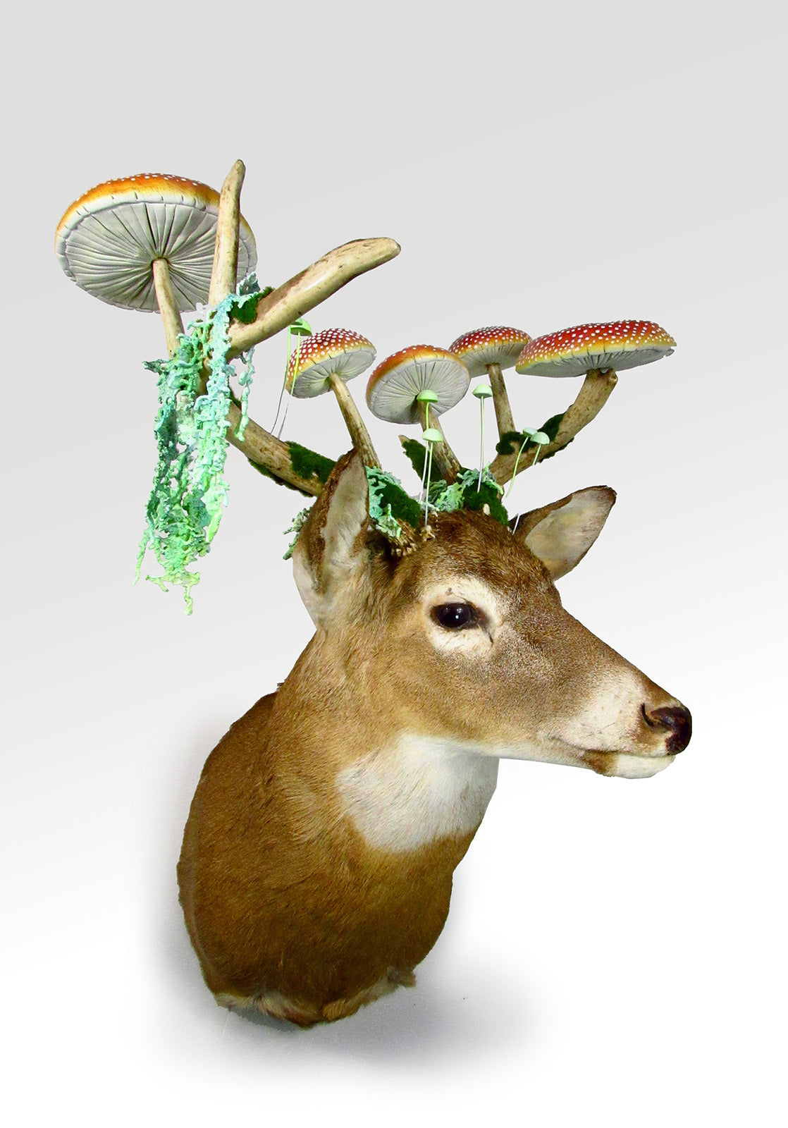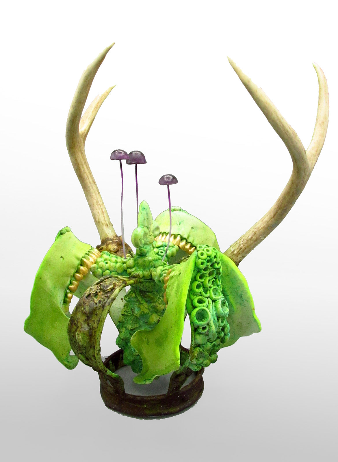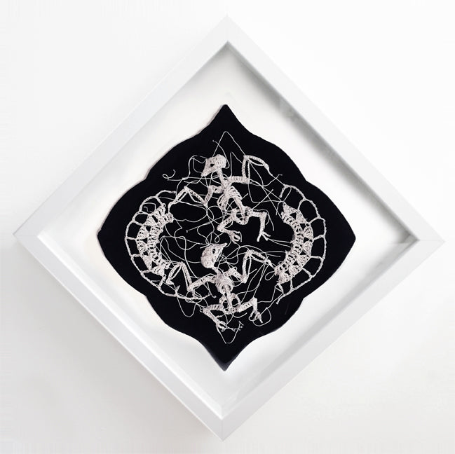 The act of stiffening intricately crocheted cotton string with glue produces material that is structurally similar to delicate bone tissue. The string implemented in this process can be viewed as the basic cellular unit of fabrication, and by utilizing media and practices inherited from my deceased relatives, I aim to generate emblems of my diminishing bloodline, embodied by each organism's skeletal remains. ~ Caitlin T. McCormack